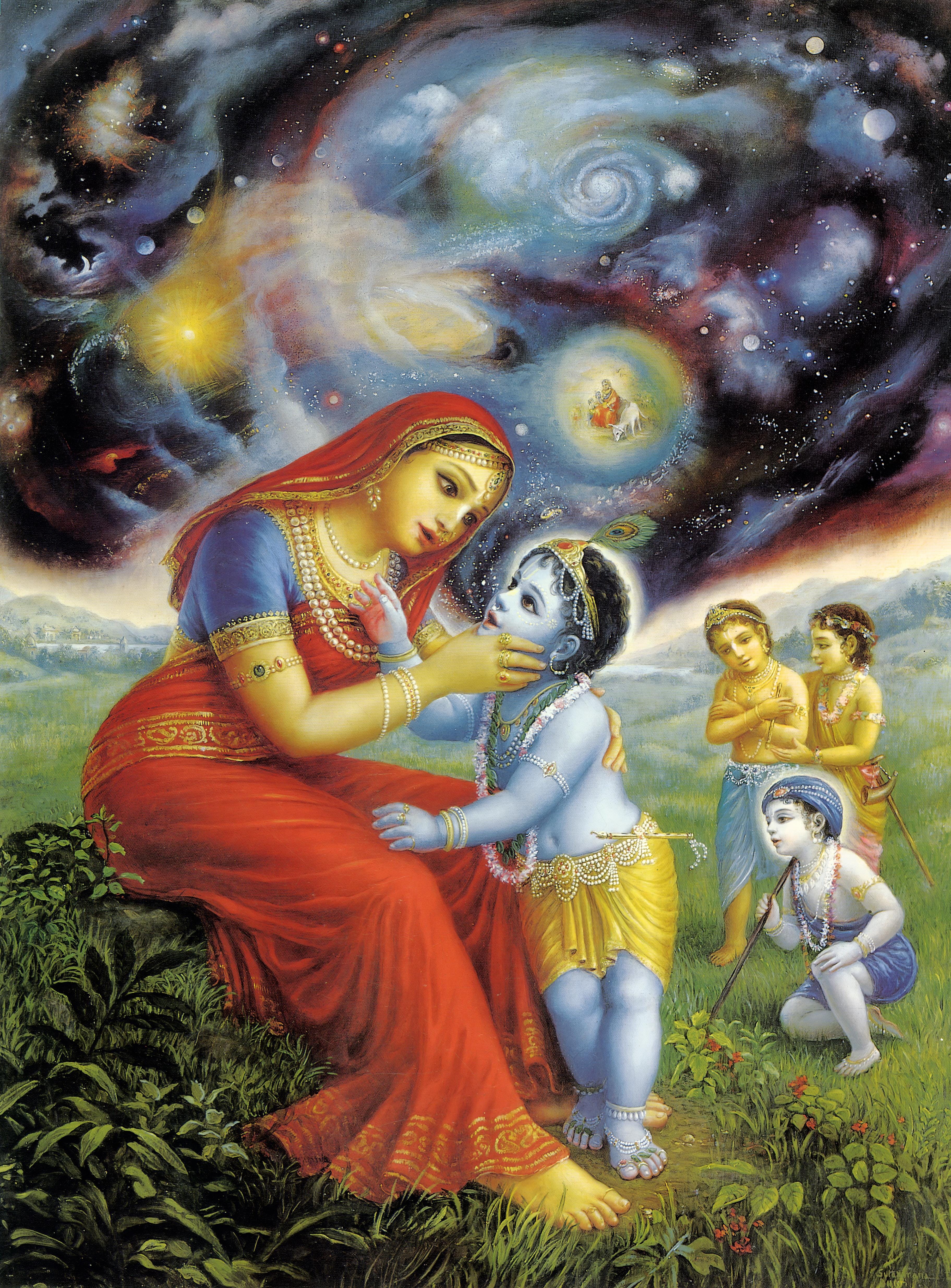 “When Kṛṣṇa opened His mouth wide by the order of mother Yaśodā, she saw within His mouth all moving and nonmoving entities, outer space, and all directions, along with mountains, islands, oceans, the surface of the earth, the blowing wind, fire, the moon and the stars. She saw the planetary systems, water, light, air, sky, and creation by transformation of ahankāra. She also saw the senses, the mind, sense perception, and the three qualities, goodness, passion and ignorance. She saw the time allotted for the living entities, she saw natural instinct and the reactions of karma, and she saw desires and different varieties of bodies, moving and nonmoving. Seeing all these aspects of the cosmic manifestation, along with herself and Vṛndāvana-dhāma, she became doubtful and fearful of her son’s nature.” (SB 10.8.37-39)