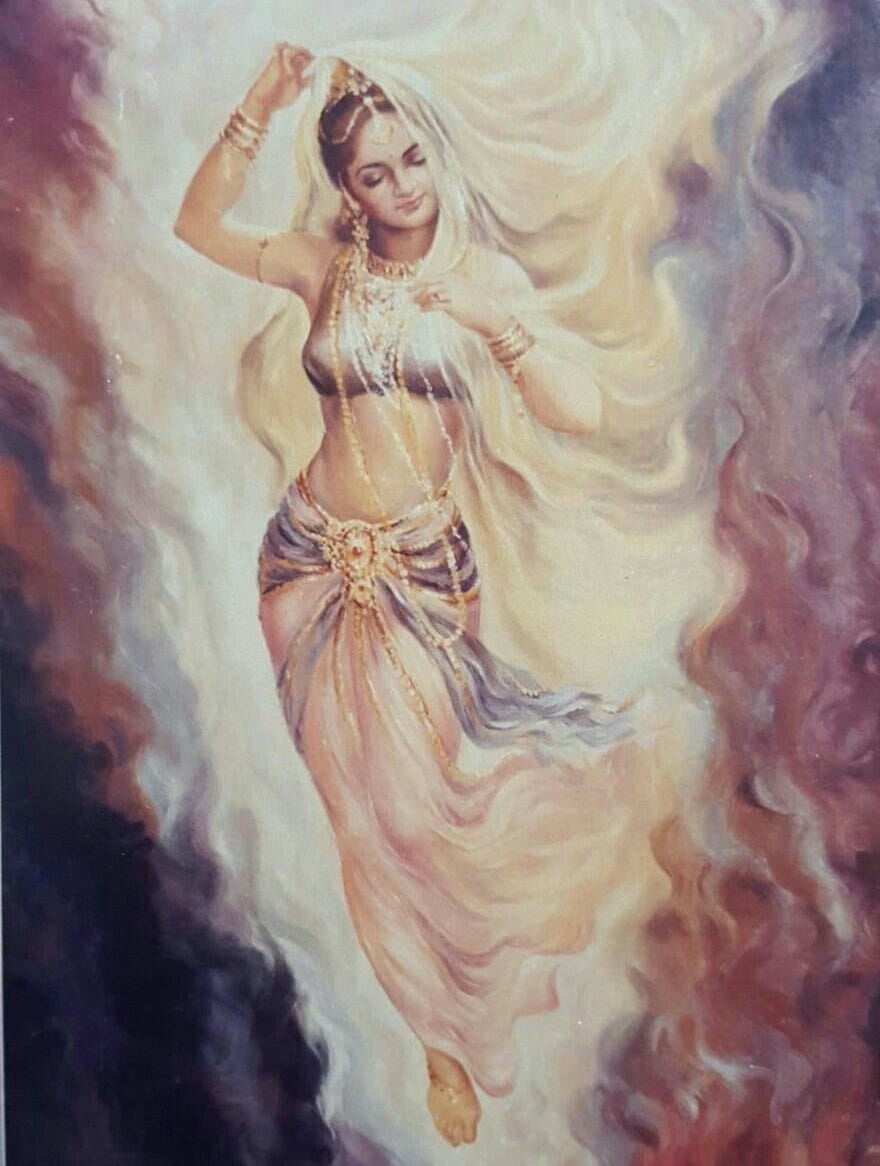 Prabhupāda describes that “When a man looks upon a woman with such lusty desires, he is captivated by her face, her breasts and her waist, for a woman first attracts a man to fulfill his sexual desires by the beautiful features of her face, by the beautiful slope of her breasts and also by her waist. Pūrvacitti was dressed in fine yellow silk, and therefore her hips looked like kadamba flowers. Because of her belt, her waist seemed to be encircled by burning cinders.”