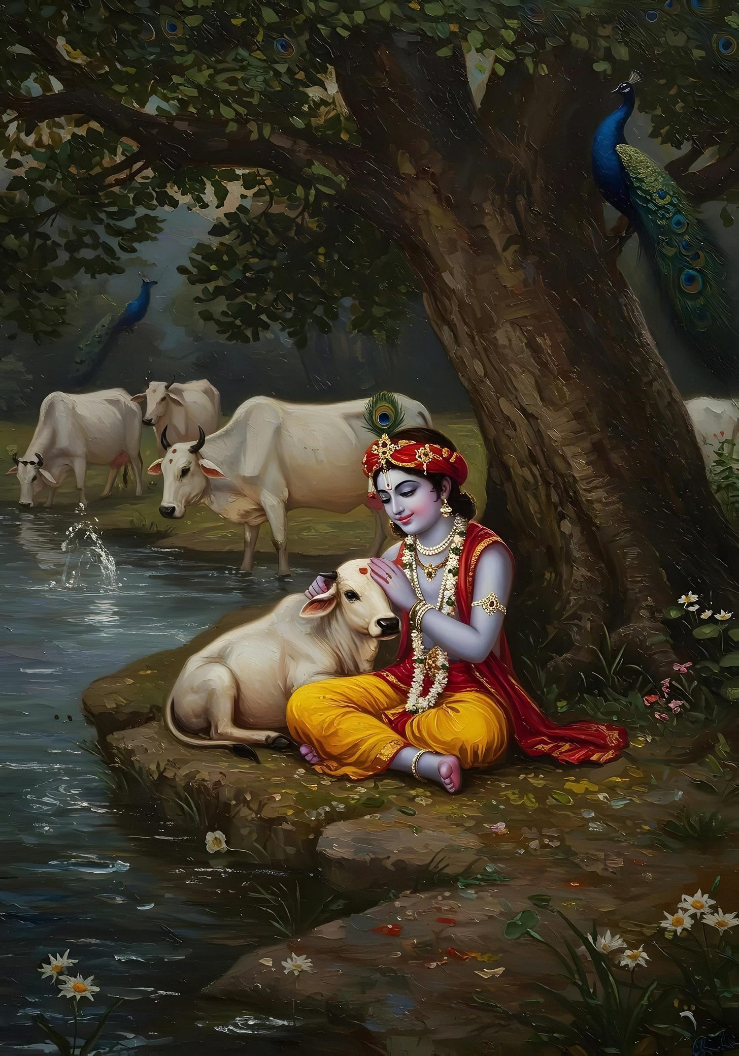 The legs of the Lord are perfectly proportioned and beautifully shaped (sama-cāru), and his feet, calves, thighs, and knees are described as exquisite and extremely pleasing to see. The yellow dhoti of the Lord leaves his lotus feet and part of his legs exposed, allowing His devotees to have a glance of His beauty. The Lord’s form is described as strong and elegant. His body is well built, radiating strength, beauty, majesty, and sweetness all at once, and His form is fully transcendental, composed of eternity, knowledge, and bliss without any trace of material imperfection.