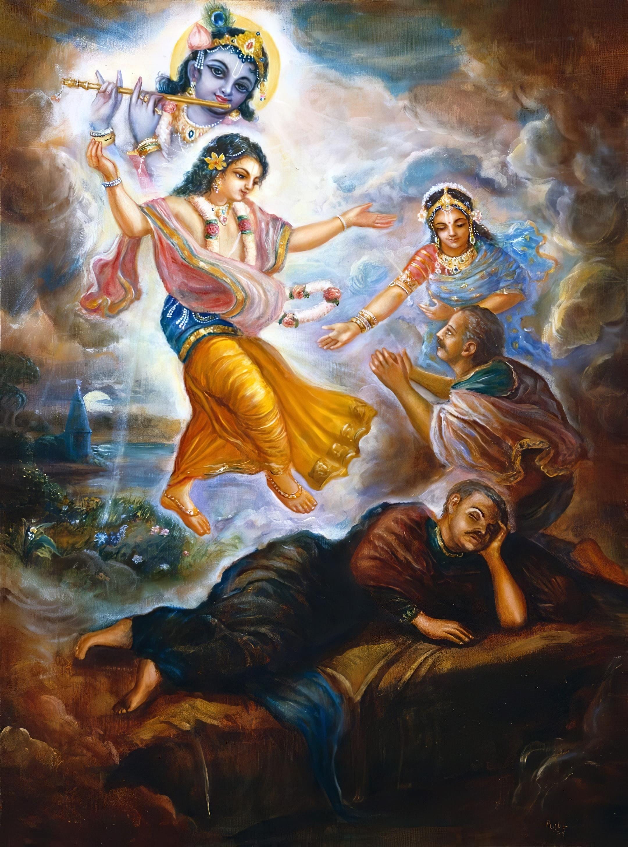 The stage of liberation is then compared to the end of such a dream, when we can again understand our real situation and wake up to the spiritual reality, centered around our eternal relationship with Krsna.
