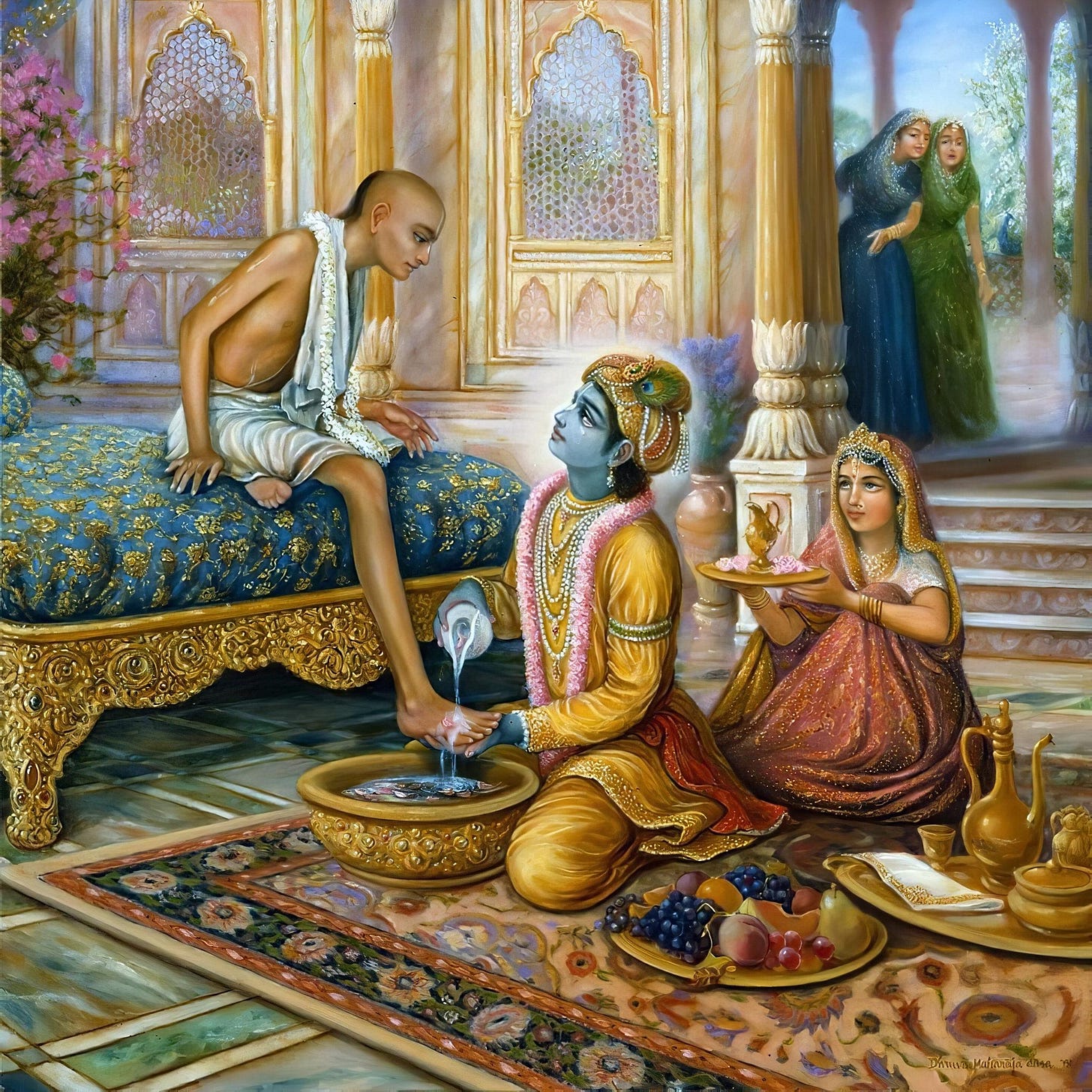 "When the Queen drank liquor, King Purañjana also engaged in drinking. When the Queen dined, he used to dine with her, and when she chewed, King Purañjana used to chew along with her. When the Queen sang, he also sang. Similarly, when the Queen cried, he also cried, and when the Queen laughed, he also laughed. When the Queen talked loosely, he also talked loosely, and when the Queen walked, the King walked behind her. When the Queen would stand still, the King would also stand still, and when the Queen would lie down in bed, he would also follow and lie down with her. When the Queen sat, he would also sit, and when the Queen heard something, he would follow her to hear the same thing. When the Queen saw something, the King would also look at it, and when the Queen smelled something, the King would follow her to smell the same thing. When the Queen touched something, the King would also touch it, and when the dear Queen was lamenting, the poor King also had to follow her in lamentation. In the same way, when the Queen felt enjoyment, he also enjoyed, and when the Queen was satisfied, the King also felt satisfaction." (SB 4.25.57-61)