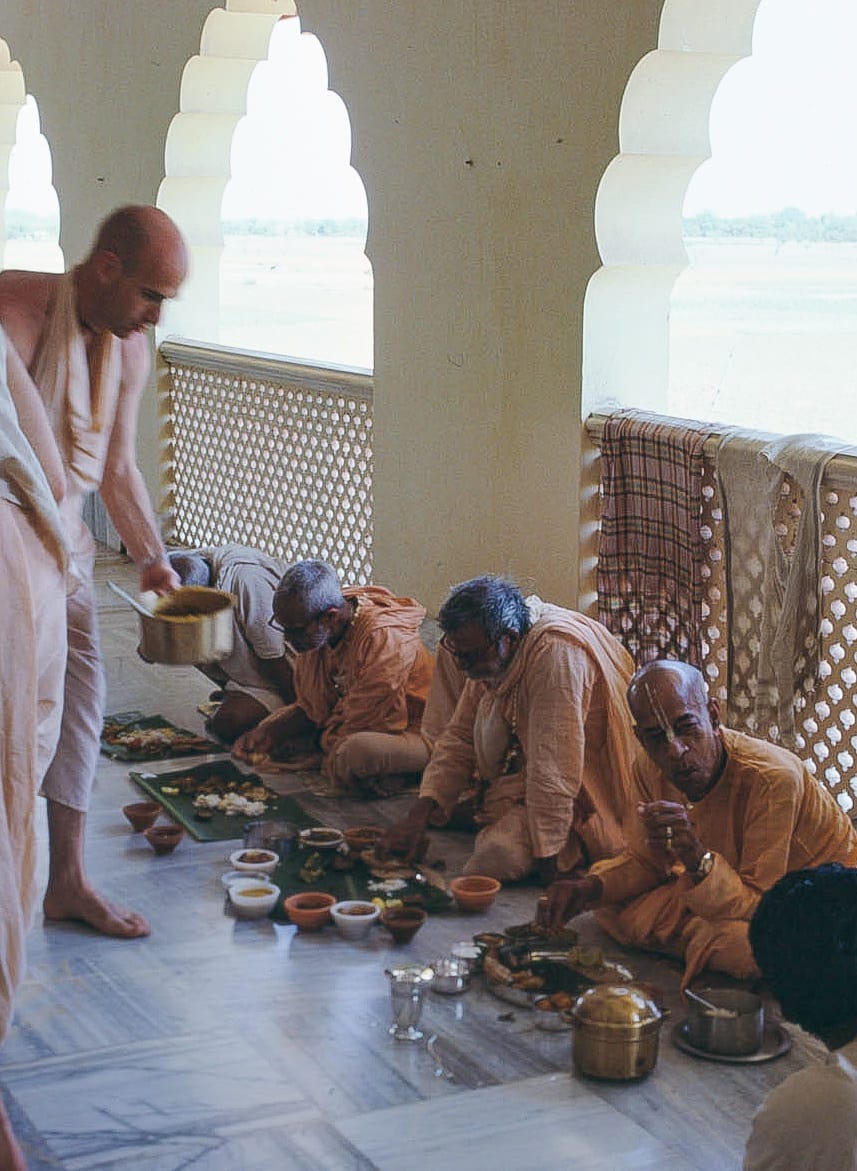 Finally, there is the polemic around carrots. There is a story mentioned in the Puranas about a Brahmana who sacrificed a cow as part of a gomedha-yajna. However, before he could rejuvenate her at the fire, his wife, being hungry, cut a piece of the flesh and cooked it without his knowledge. However, before eating it, she had a change of heart and decided to just throw the pieces of meat away. Later, when the Brahmana resurrected the cow, the pieces of meat she had thrown away also came back to life. A piece that fell into the water became fish, and the parts that fell into the earth became different types of vegetables. Many Vaiṣnavas relate carrots to such vegetables that appeared from this pastime and thus avoid them, but Prabhupada didn’t consider it important (or maybe he didn’t agree with this interpretation) since he didn’t establish such restrictions in our society. According to disciples who were with him, he was himself consuming carrots.