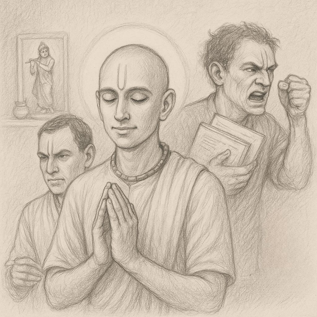 A devotee contaminated by the mode of ignorance will show qualities such as pride, anger, and violence. Such a person is defined by Lord Kapila as a separatist because his desires are not dovetailed with the Lord. In other words, the Lord desires one thing, and he desires another. Even though he becomes somehow or other attracted to the practice of devotional service and the association of devotees, his practical actions are contrary to the desires of the Lord. He may act in inconsiderate, dismissive, offensive, or even violent ways against other devotees and people in general, engage in dishonest activities, tell lies, spread rumors, and so on.