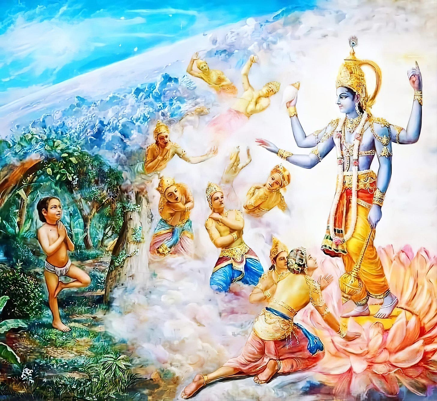 After reassuring the demigods that He would protect them, the Lord went to the Madhuvana Forest to see Dhruva, mounted on Garuḍa.