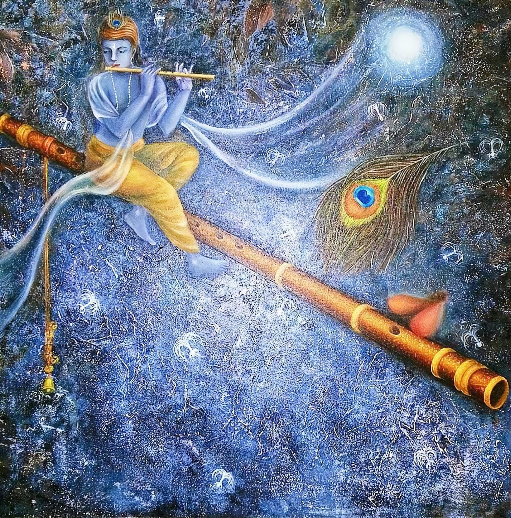 The second is the dreaming state, where consciousness is turned inwards. In this state, called taijasa, the seven limbs and nineteen faculties contact subtle sense objects in dreams. In this way, the jīva enjoys dreamy experiences, enabled by Taijasa, the luminous Lord.