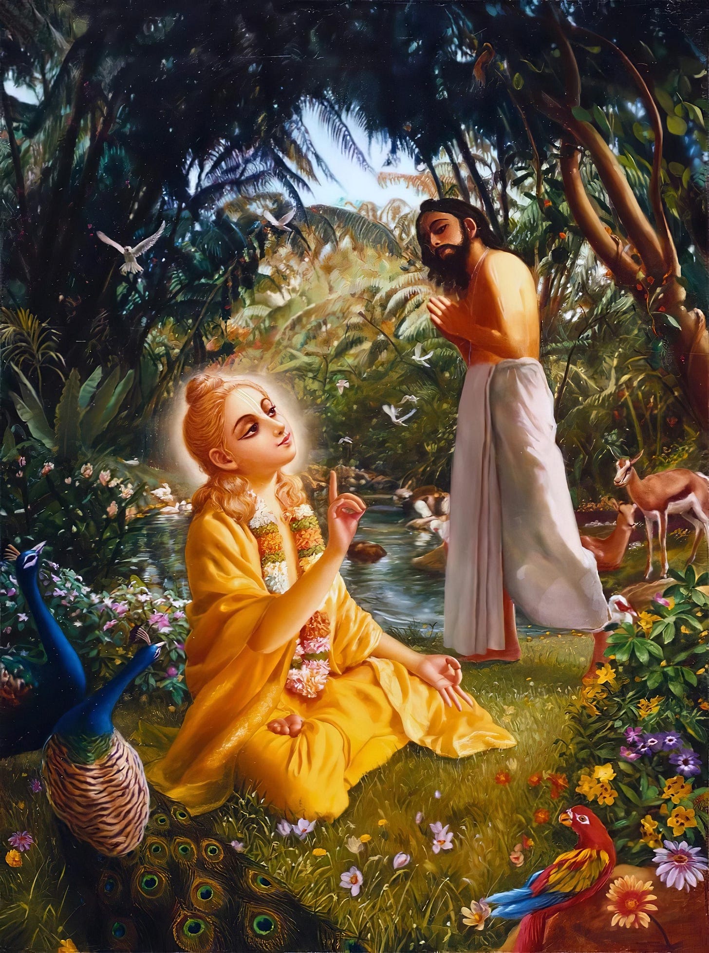 "At that time, Lord Kṛṣṇa was sitting on the bedstead of Queen Rukmiṇī. Even from a considerable distance He could see the brāhmaṇa coming to His home, and He could recognize him as His friend. Lord Kṛṣṇa immediately left His seat and came forward to receive His brāhmaṇa friend and, upon reaching him, embraced the brāhmaṇa with His two arms. Lord Kṛṣṇa is the reservoir of all transcendental pleasure, yet He Himself felt great pleasure upon embracing the poor brāhmaṇa because He was meeting His very dear friend. Lord Kṛṣṇa had him seated on His own bedstead and personally brought all kinds of fruits and drinks to offer him, as is proper in receiving a worshipable guest. Lord Śrī Kṛṣṇa is the supreme pure, but because He was playing the role of an ordinary human being, He immediately washed the brāhmaṇa’s feet and, for His own purification, sprinkled the water onto His head. After this the Lord smeared the body of the brāhmaṇa with different kinds of scented pulp, such as sandalwood, aguru and saffron. He immediately burned several kinds of scented incense and, as is usual, offered him ārati with burning lamps. After thus offering him an adequate welcome and after the brāhmaṇa had taken food and drink, Lord Kṛṣṇa said, “My dear friend, it is a great fortune that you have come here." (KB ch. 80)