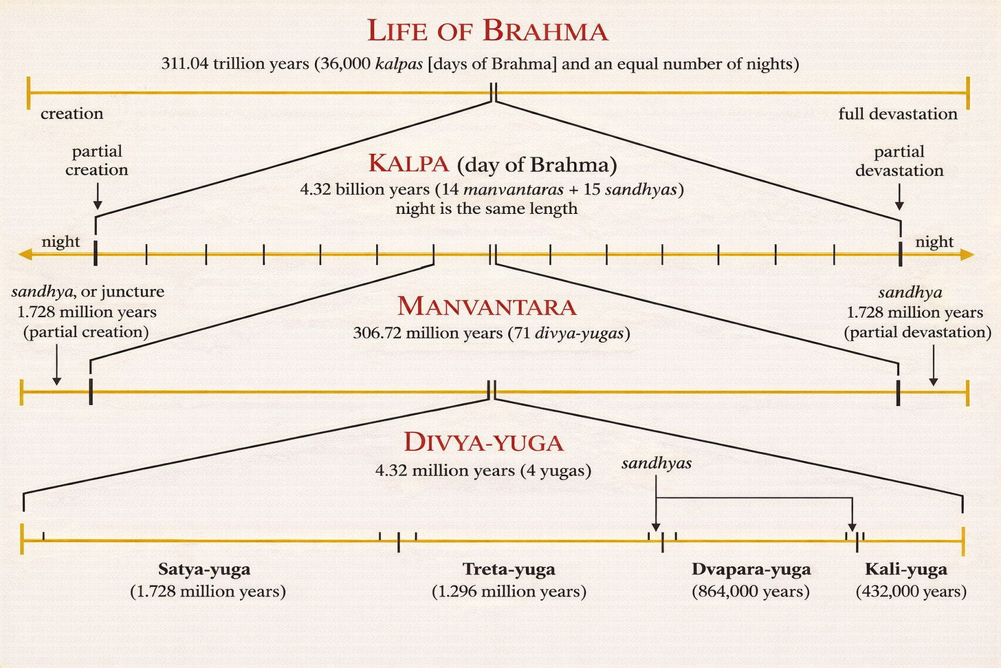 Next are the really large cycles of time, which measure time up to the total duration of the universe. That’s the full unit during which time remains active, influencing matter, a complete cycle of creation.