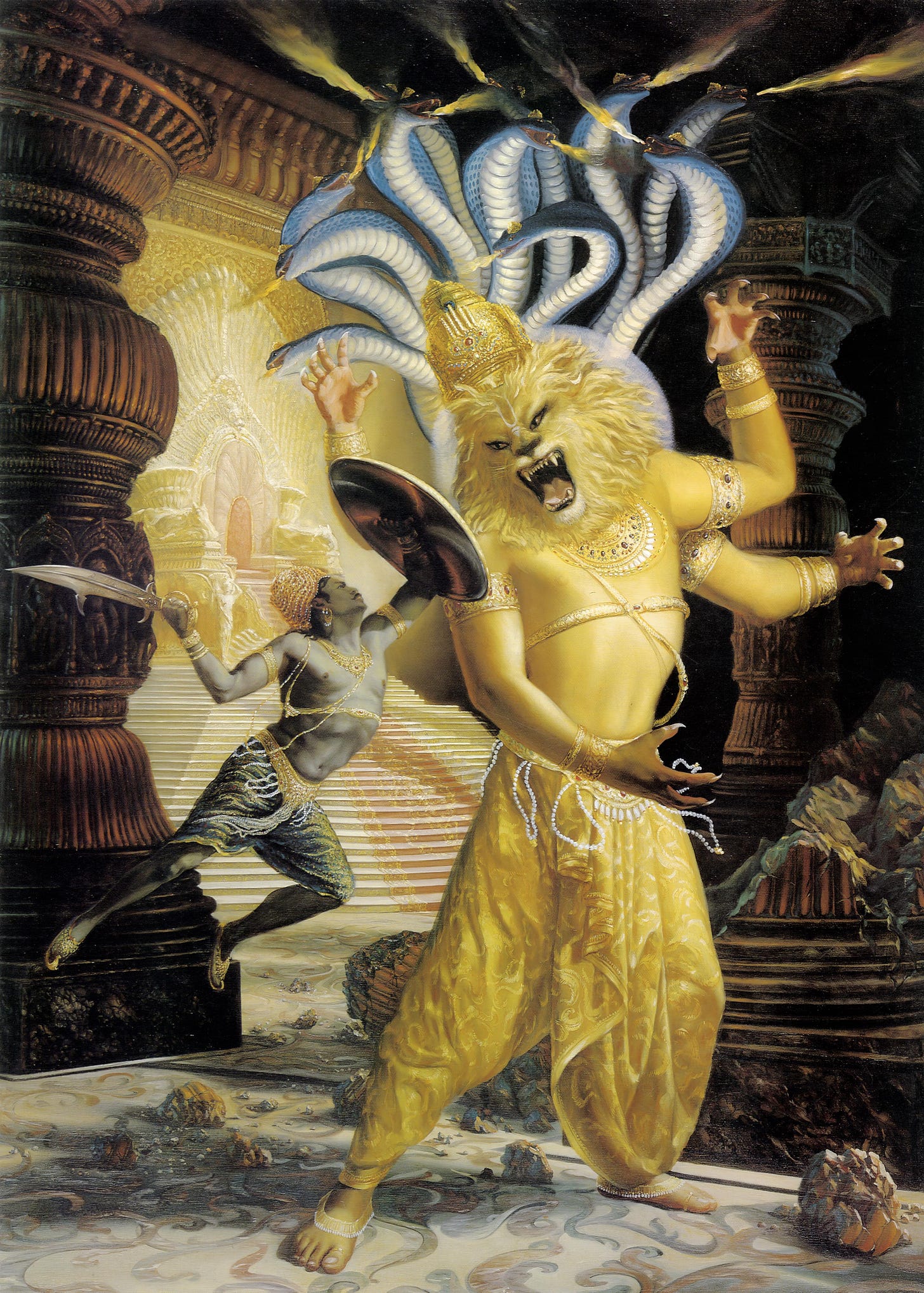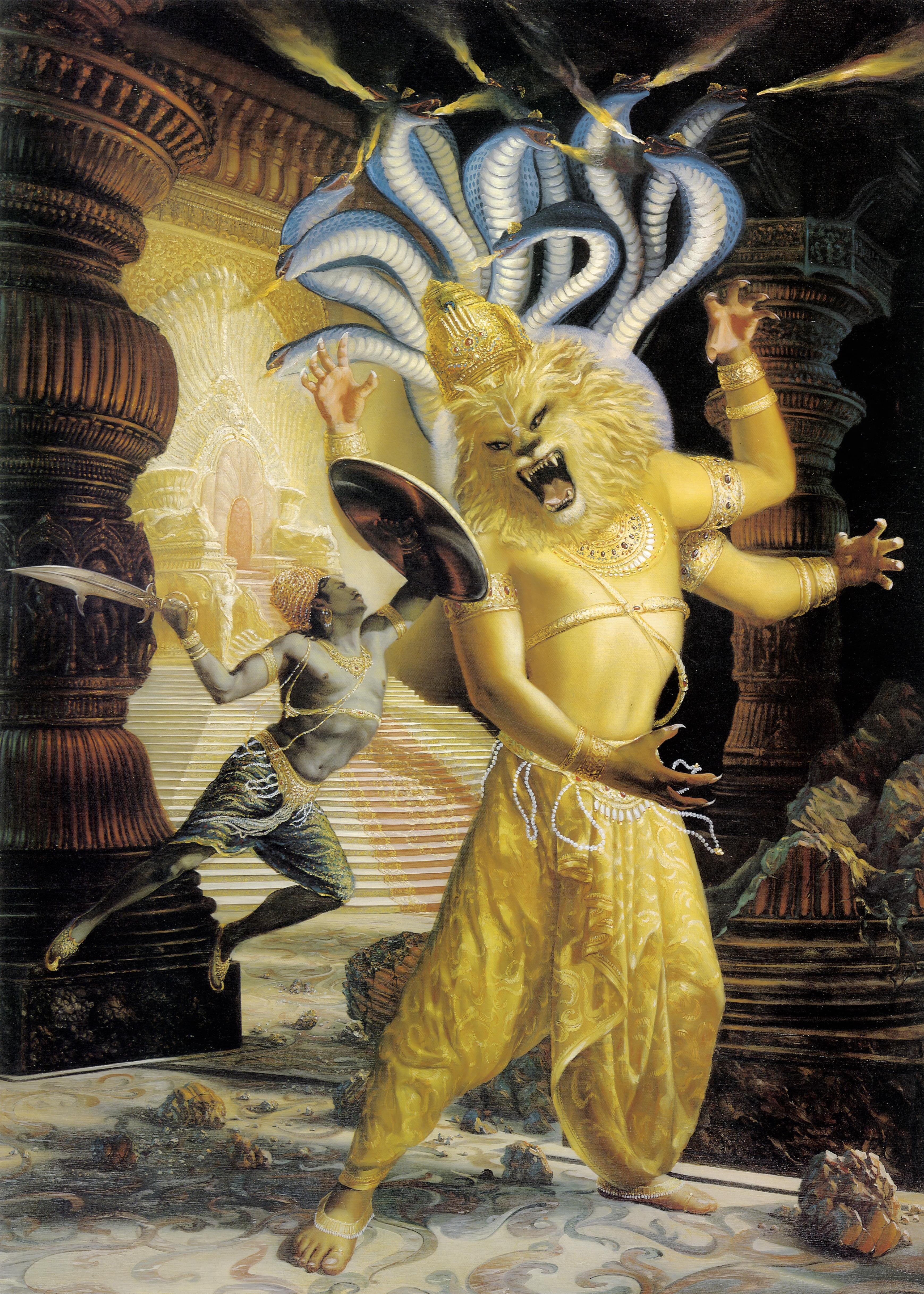However, despite Diti’s best efforts, Hiranyaksa and Hiraṇyakaśipu started causing disturbances even from inside the womb. Even as small embryos, they were extremely powerful and started blocking the light of the sun and the moon, leaving the planets of the universe in darkness.