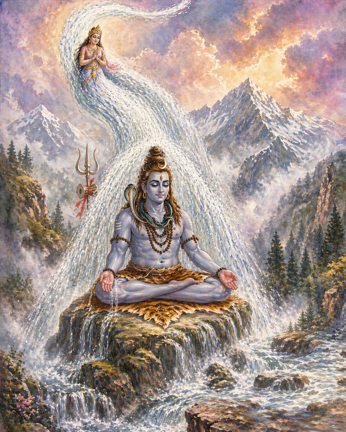 The river Ganges starts from the Causal Ocean as a spiritual river. As it enters the universe, it manifests as a flow in the subtle platform, subtle water that the demigods can see, and transport in their vimānas all the way to the celestial moon. From there, this subtle river flows to the intermediate planetary system of Bhū-mandala, falling on the head of Lord Śiva, and eventually reaching our planet. This spiritual river is not only composed of spiritual water but also has a predominating deity, Gaṅgā. Just as there is a demigod who controls the rain, Indra, and another who controls the sun, Surya, the river Ganges also has a personification. Gaṅgā is thus simultaneously a river and a goddess who married Śāntanu and became the mother of Bhīṣma.