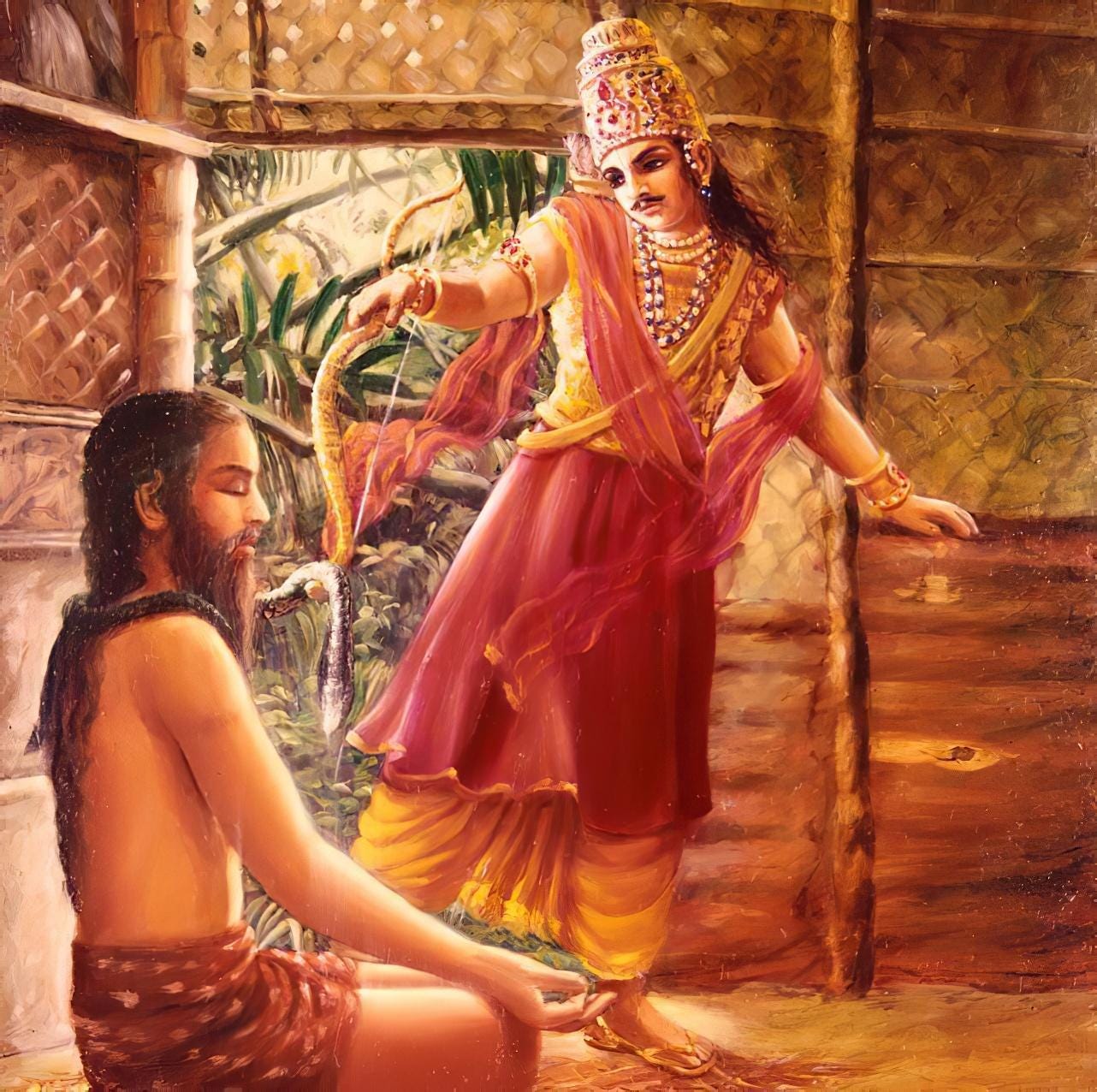 Even though Pariksit asked for water repeatedly, the sage didn't answer. The king thought that the sage was pretending to be in samādhi just to avoid receiving him, who was, by social position, inferior, being a Ksatriya, while the sage was a Brahmana. Therefore, to reciprocate the cold reception, the King used his bow to collect a dead snake that was lying on the floor and put it around the neck of the sage, like a garland.