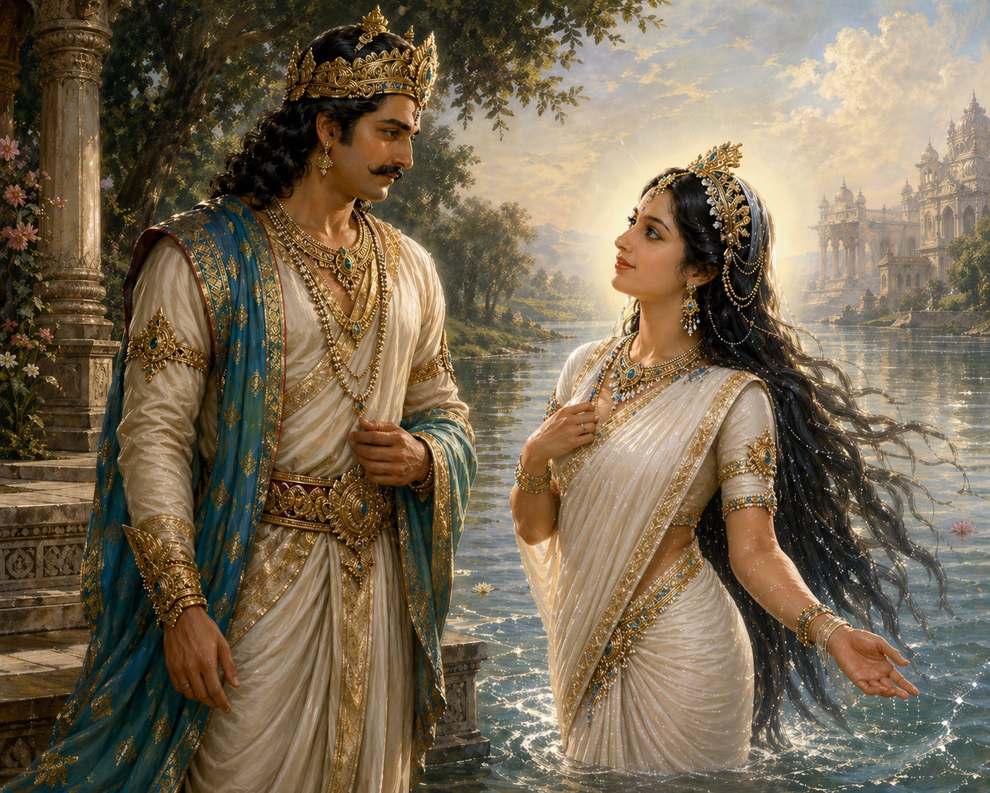 Once, Śāntanu met Gaṅgādevī, the personification of the river Ganges, while walking on the banks of the river. Without knowing who she was, Śāntanu immediately courted the beautiful maiden, who agreed to marry him under the condition that he would never question anything she did, whether good or bad. If he ever questioned her, she would leave immediately.