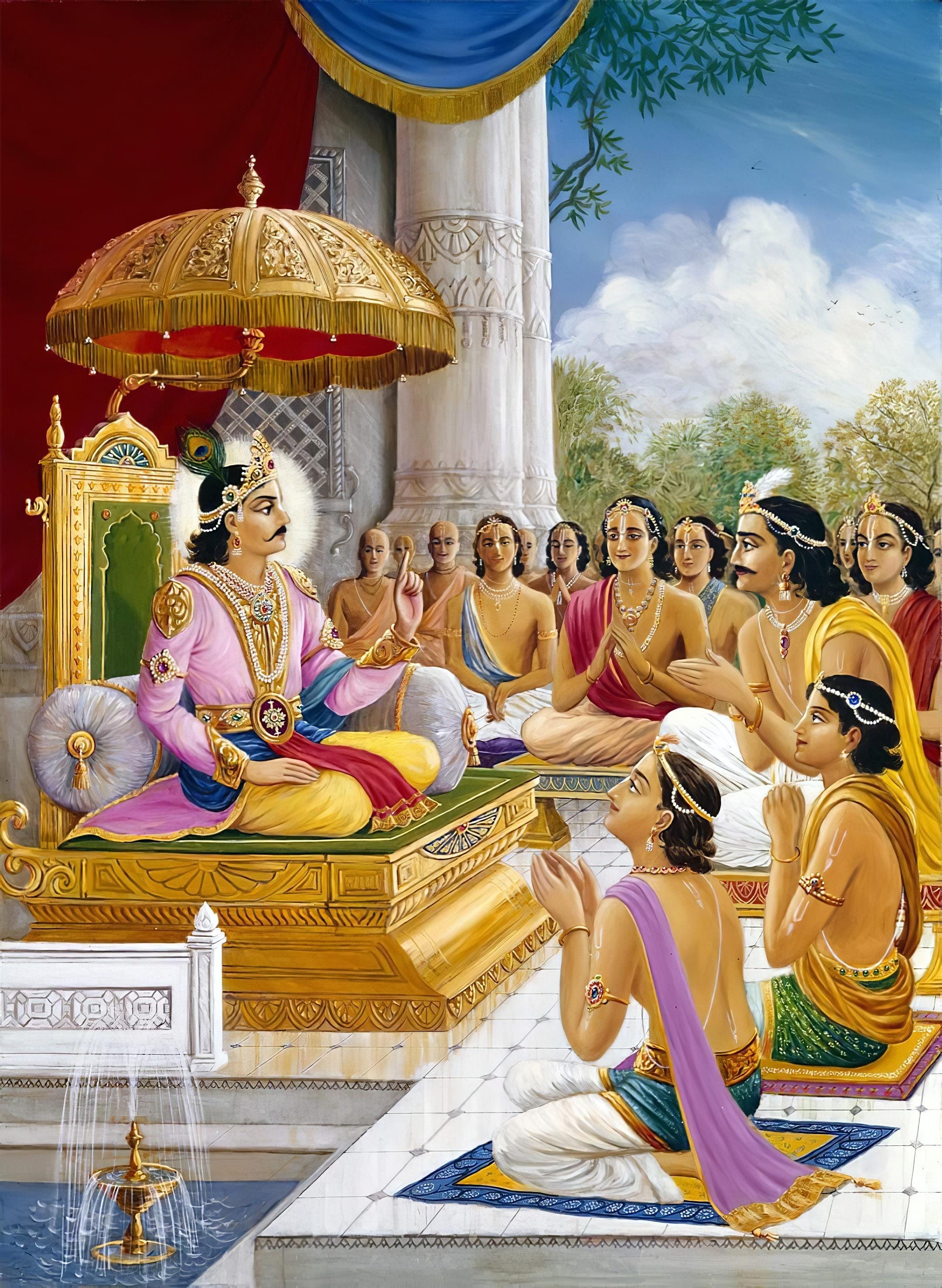 “Lord Viṣṇu appeared before King Nābhi with four arms. He was very bright, and He appeared to be the best of all personalities. Around the lower portion of His body, He wore a yellow silken garment. On His chest was the mark of Śrīvatsa, which always displays beauty. He carried a conchshell, lotus flower, disc and club, and He wore a garland of forest flowers and the Kaustubha gem. He was beautifully decorated with a helmet, earrings, bangles, belt, pearl necklace, armlets, ankle bells and other bodily ornaments bedecked with radiant jewels. Seeing the Lord present before them, King Nābhi and his priests and associates felt just like poor people who have suddenly attained great riches. They received the Lord and respectfully bent their heads and offered Him things in worship.” (SB 5.3.3)