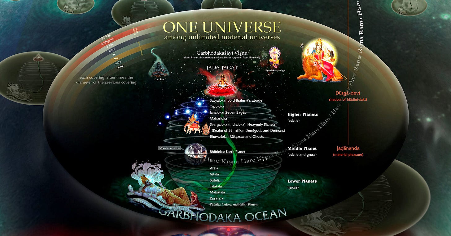 Each material universe is like a coconut, with a hollow central part half-filled with water and surrounded by seven coverings. Outside these coverings are the spiritual waters of the causal ocean, where Lord Mahā-Viṣṇu stays. This water is pure in itself, but it became even more sacred after touching the lotus feet of the Lord, becoming the transcendental river Ganges.