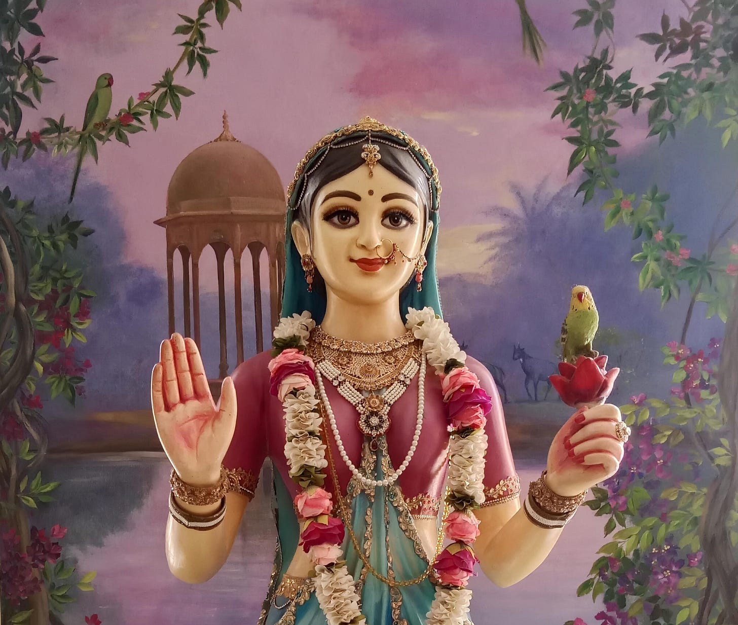 Narada Muni instructed Mrigari: “Build a small cottage on the banks of the Ganga, plant Tulasi, chant in front of her, and water her every day. Simply by doing this, you will become purified.” Mrigari followed these instructions, and within a relatively short time, he became transformed, his heart became soft, his consciousness became clean, and he developed devotional qualities. People from nearby villages began visiting him and bringing him bhoga, and he no longer needed to struggle for maintenance. He simply chanted and took care of Tulasi, and by this simple service, he became elevated.