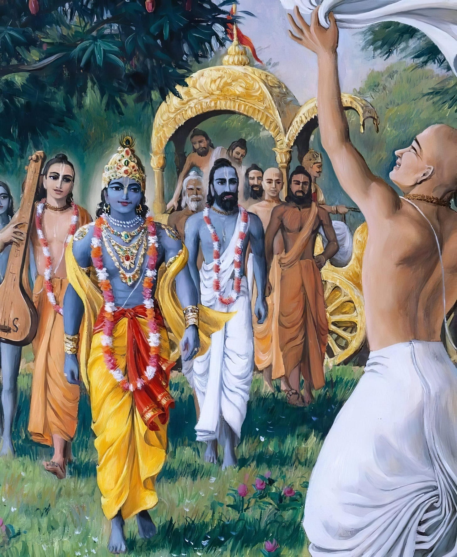 He arrived at the river and prepared to drink water with his joined pals when a young girl appeared and asked him to come to her house, where they had some nice, pure water. Nārada accepted the invitation and was served very nicely by the girl and her father, who received the saint with all the respect deserved by a great sadhu. Nārada became pleased with their service attitude and asked if there was anything he could do for them, to which the father humbly asked him to marry his daughter and become his son-in-law. Attracted by the beauty of the girl and at the same time obliged by their service, Nārada agreed.