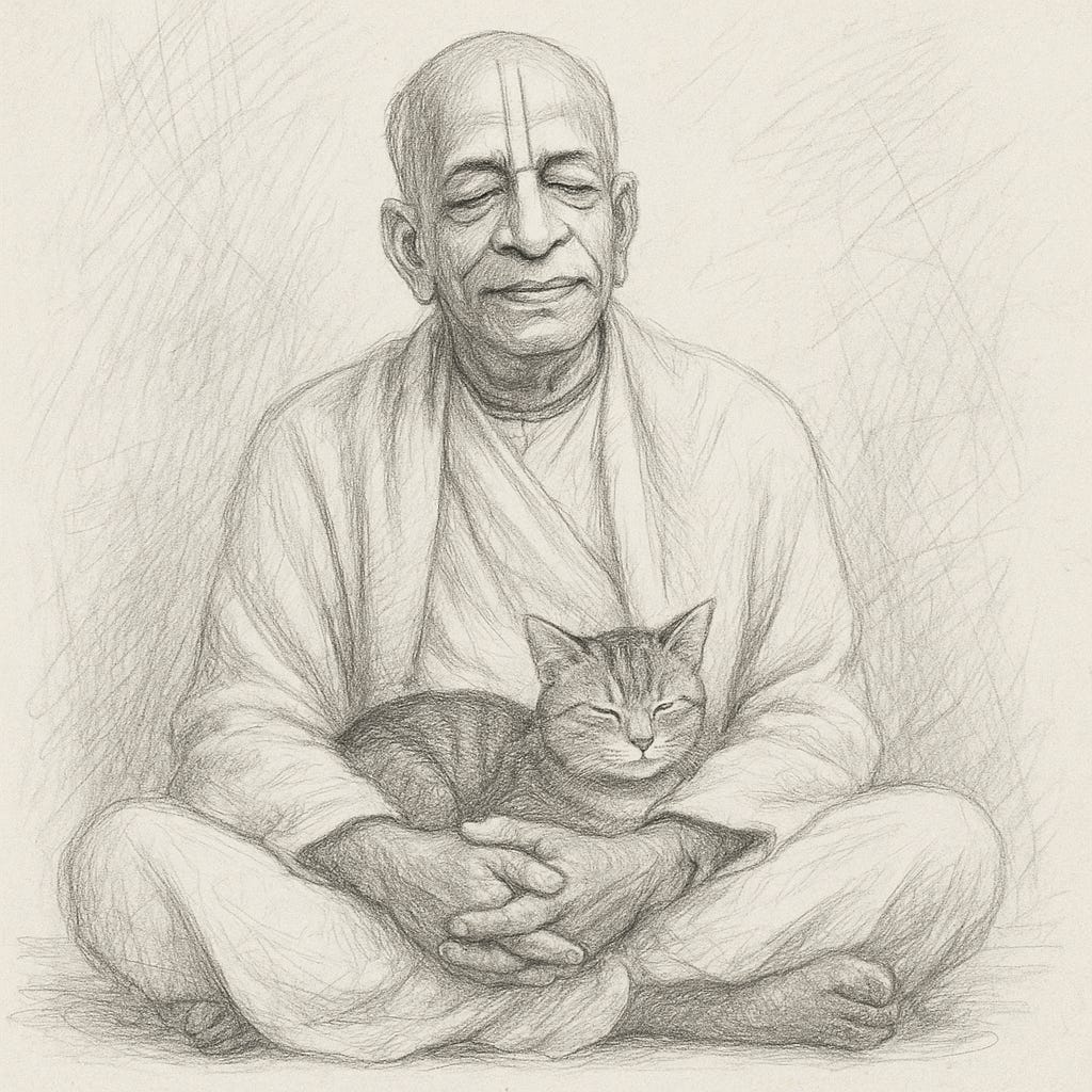 Once, Śrila Prabhupāda was giving a lecture to a small group of disciples in India, when a cat unexpectedly appeared and lay on his lap. Śrila Prabhupāda didn’t seem disturbed by the cat and allowed it to stay there for some time. Later, he used this situation to illustrate the point that betraying someone who takes shelter of us in good faith is an extremely serious sin. He said: “If I take shelter of you, if I put my head on your lap, and you cut my throat, that’s the worst sin.”