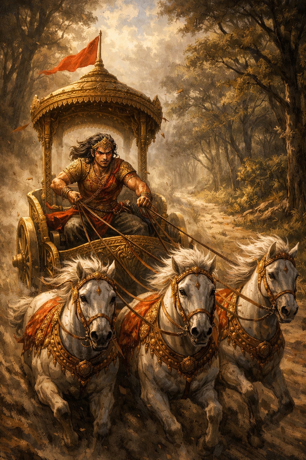 Arjuna and Bhīma dragged Aśvatthāmā to his feet and, unbinding him, drove him from the camp. Deprived of his jewel and cursed by Kṛṣṇa, his power was gone and he disappeared into the woods to begin his lonely exile.”