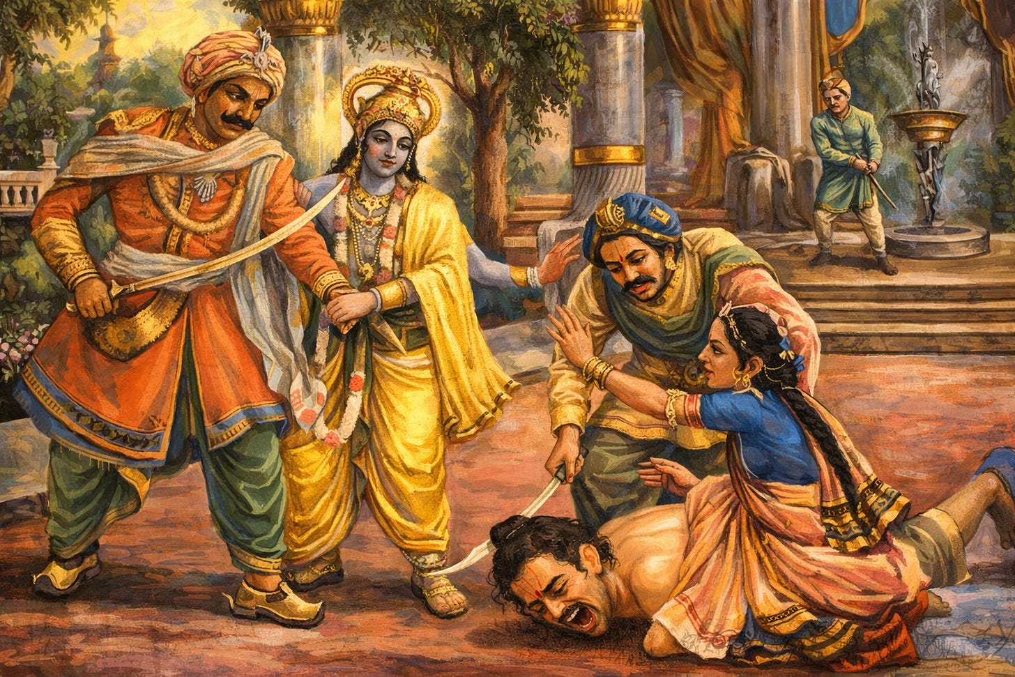 “When the respective warriors of both camps, namely the Kauravas and the Pāṇḍavas, were killed on the Battlefield of Kurukṣetra and the dead warriors obtained their deserved destinations, and when the son of Dhṛtarāṣṭra fell down lamenting, his spine broken, being beaten by the club of Bhīmasena, the son of Droṇācārya [Aśvatthāmā] beheaded the five sleeping sons of Draupadī and delivered the heads as a prize to his master, foolishly thinking that he would be pleased. Duryodhana, however, disapproved of the heinous act, and he was not pleased in the least.”