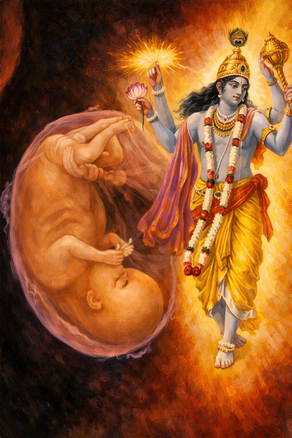 However, this didn’t stop Aśvatthāmā, who, after being freed, released another brahmāstra, this time at Uttara, to kill Parīkṣit, the last descendant of the Pandavas, while he was still in the womb. This led Kṛṣṇa to personally intervene to save the life of his pure devotee. Because of this incident, Parīkṣit could have a brief darśana of the Lord, which created a deep impression on him. The name Parīkṣit means “examiner” because he was constantly examining everyone he saw, searching for the personality he could briefly see while in the womb.