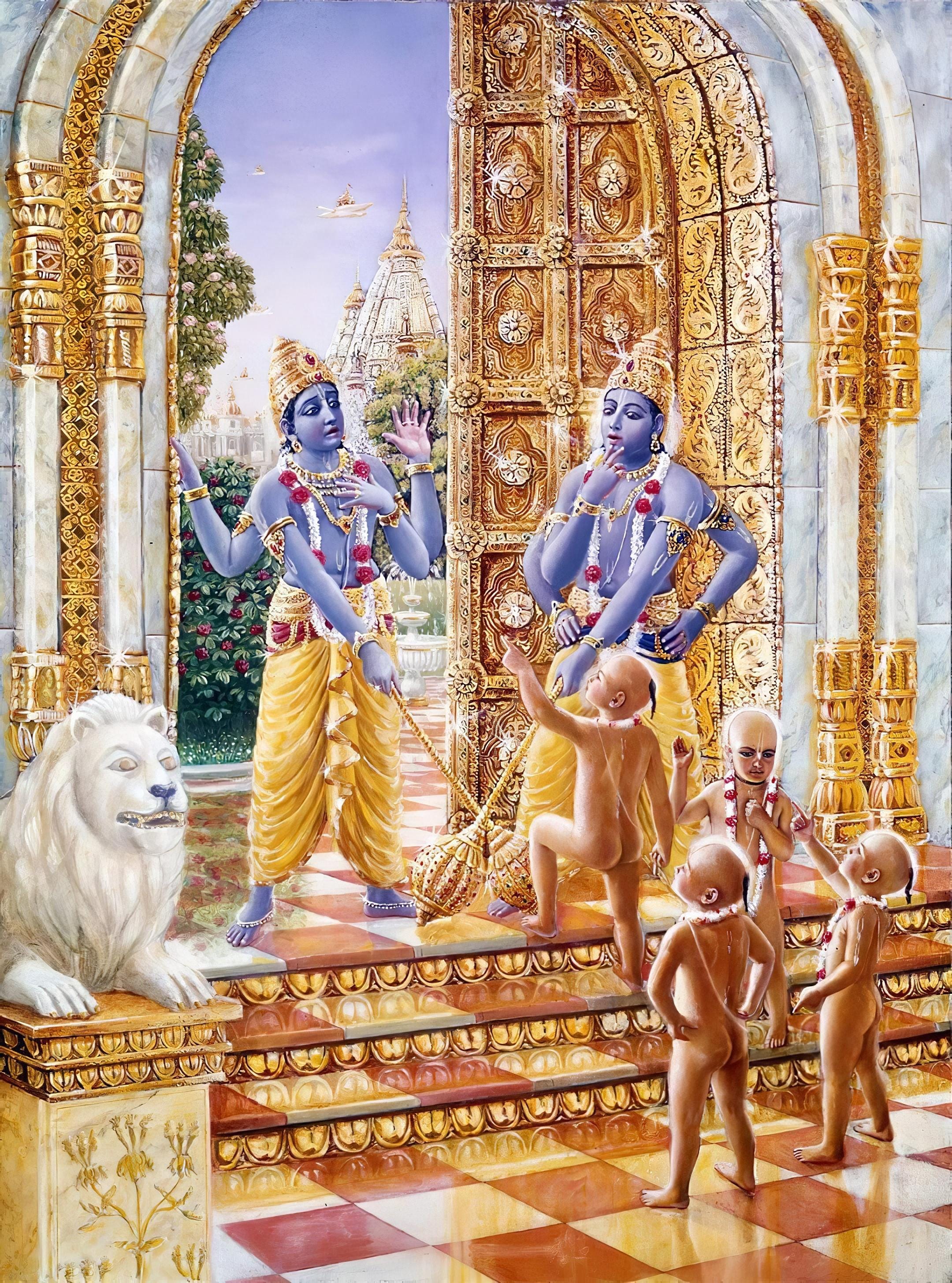 The Lord then addressed Jaya and Vijaya, revealing that although He could nullify the curse of the sages, He chose not to do so. Instead, He gave His approval to it, fixing a term of three lives, in which Jaya and Vijaya would come to the material world as demons, and then return to their positions in the spiritual world. With this, the scene for many of the pastimes narrated in the Śrīmad-Bhāgavatam was set. Jaya and Vijaya would appear as Hiraṇyakaśipu and Hiraṇyākṣa, setting the stage for the appearance of the Lord as Varāhadeva and Nṛsimhadeva, as well as the appearance of Prahlāda Maharaja and others. Later, they would appear as Rāvaṇa and Kumbhakarṇa, leading to the appearance of Lord Rāma and many wonderful pastimes, and in their last lives they would come as Śiśupāla and Dantavakra, participating in the Lord’s pastimes outside Vṛndāvana.