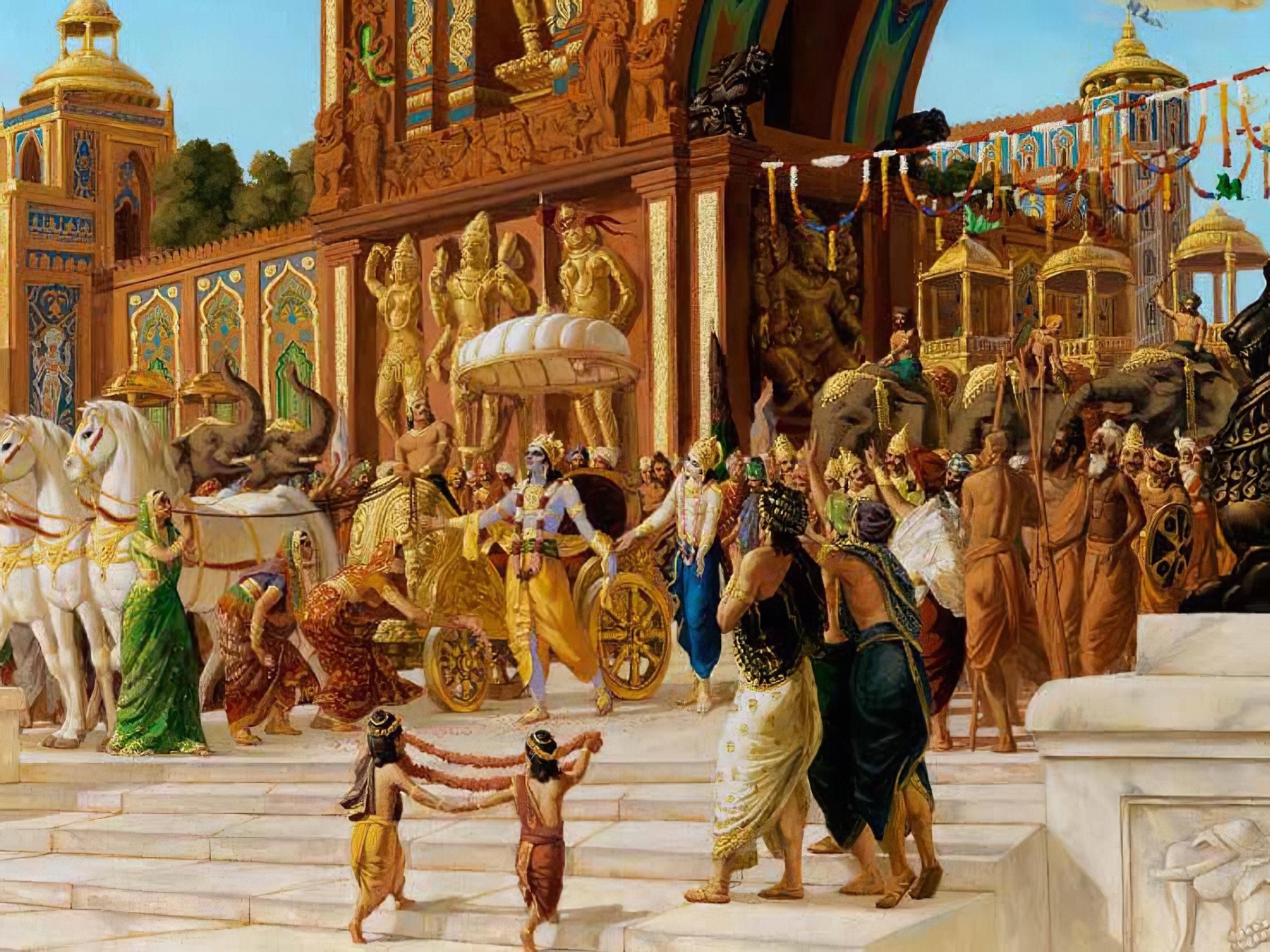 The entrance of Krsna in Dvārakā is described in the first canto of Srimad Bhāgavatam, chapter 11. There is a lot of spiritual significance in these verses.