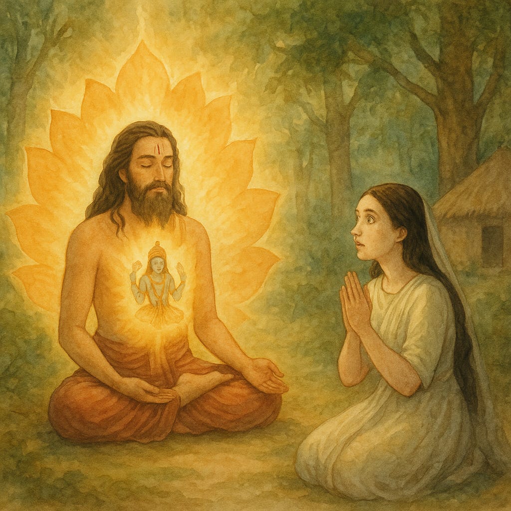 Through his practice of devotional service, Kardama Muni had risen to the highest platform, obtaining love of Godhead. Now, being completely satisfied with the selfless service of his wife, he wanted to share the ultimate realization with her. Normally, it is not expected that a woman may obtain love of Godhead by just serving her husband, but if the husband is a pure devotee like Kardama Muni, this is possible, because a dedicated wife shares the results of the pious activities or the devotional service of her husband. As Prabhupada explains: