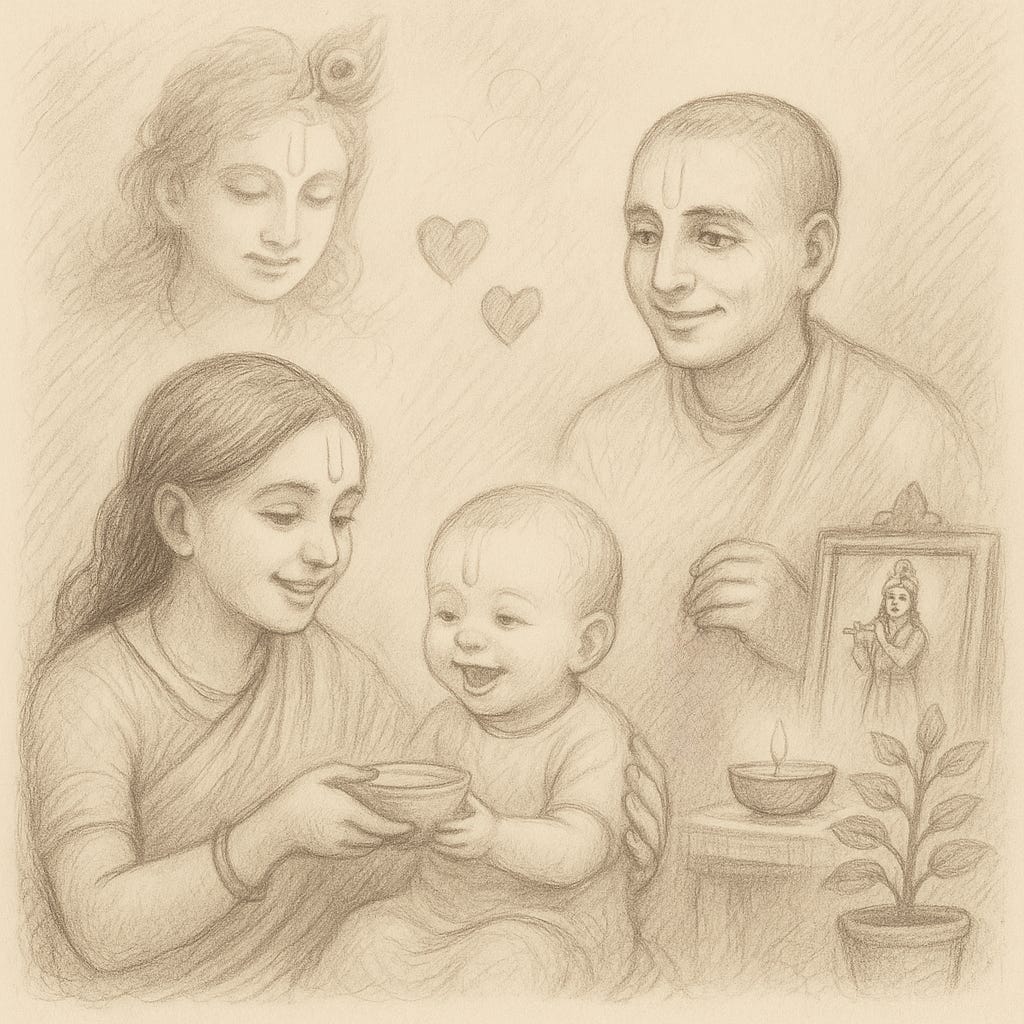 For one coming from a modern materialistic society, the idea of being happy by satisfying someone else may sound very alien, but it’s actually quite easy to understand. Parents often identify more with the happiness of their children than with their own comfort. A senior lady, a disciple of Śrila Prabhupāda, once commented to me how she was surprised when she saw a mother taking out the pieces of paneer in her sabji to feed her small child. She said she could not understand it at the time, since she liked panner, but after getting her own baby, she said, she started doing the same thing. A mother feels much happier when the baby gets something than when she personally gets it, so she tries to give him all the best. Similarly, a pure devotee feels happier when Kṛṣṇa enjoys something than when he himself enjoys; therefore, he wants to give all the best for Kṛṣṇa, and he feels happy when he sees Kṛṣṇa is happy.