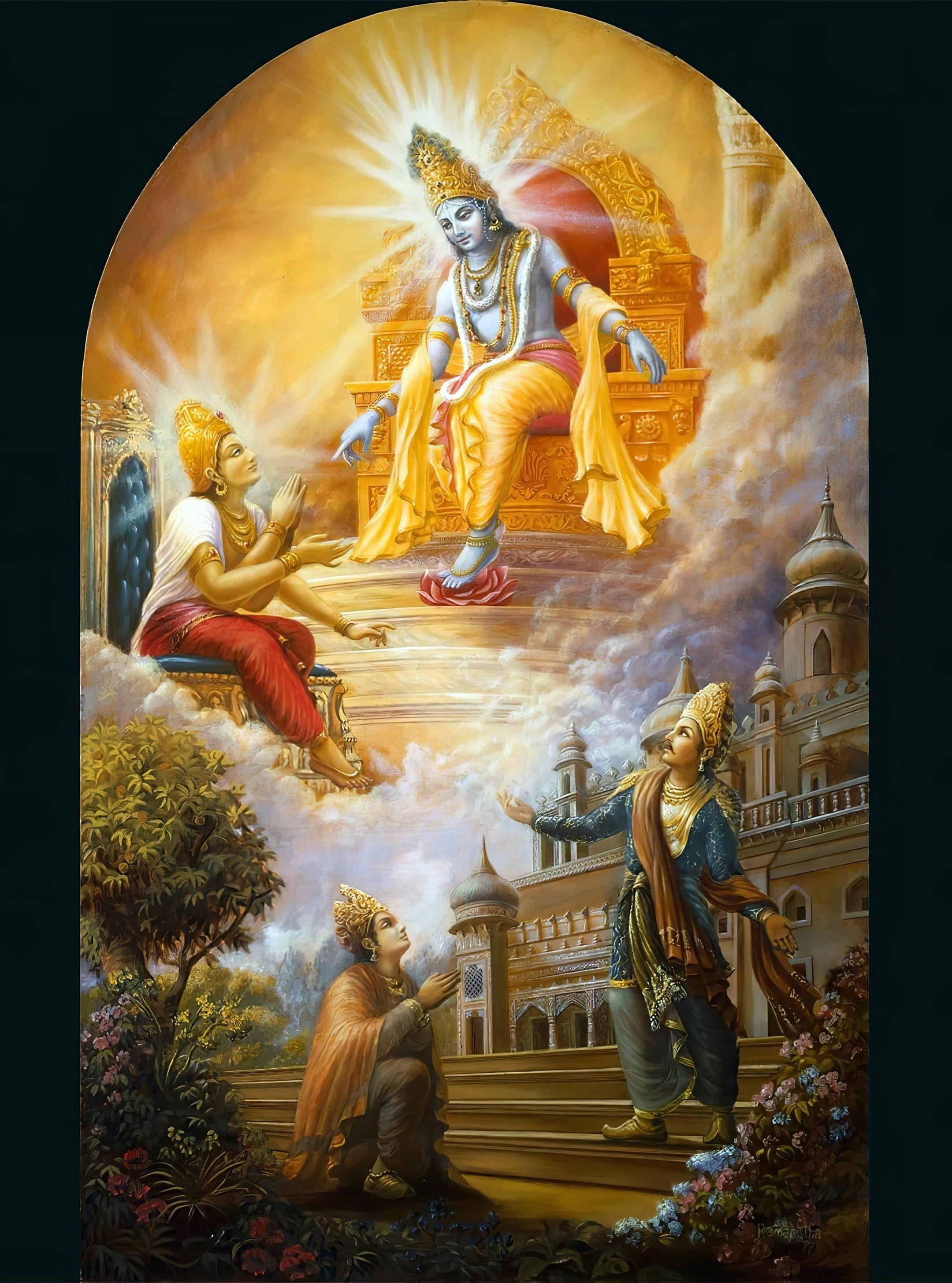 “Svāyambhuva Manu, with the assistance of Lord Brahmā, thus fulfilled his desires. With the permission of the great sage Nārada, he delivered to his son the governmental responsibility for maintaining and protecting all the planets of the universe. He thus achieved relief from the most dangerous, poisonous ocean of material desires.