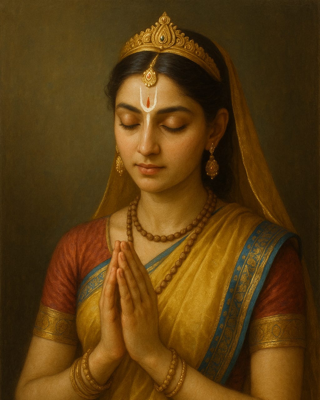 In the allegory, the daughter of Malayadhvaja represents the very plant of bhakti, the bhakti-latā-bīja, which sprouts in the heart of the king, and grows supported by the seven brothers, the seven processes of devotional service practiced by him. The girl married Agastya, who is defined by Baladeva Vidyābhūṣaṇa as the mind, illustrating how devotion conquered the very mind of the king, making him fully fixed in the service of the Lord.