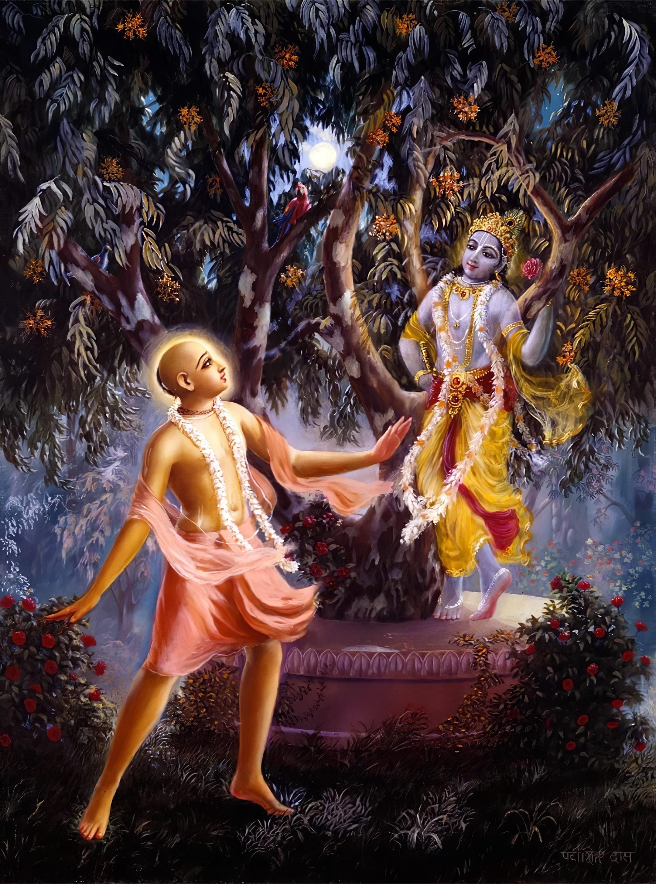 “In the Age of Kali, intelligent persons perform congregational chanting to worship the incarnation of Godhead who constantly sings the names of Kṛṣṇa. Although His complexion is not blackish, He is Kṛṣṇa Himself. He is accompanied by His associates, servants, weapons and confidential companions.