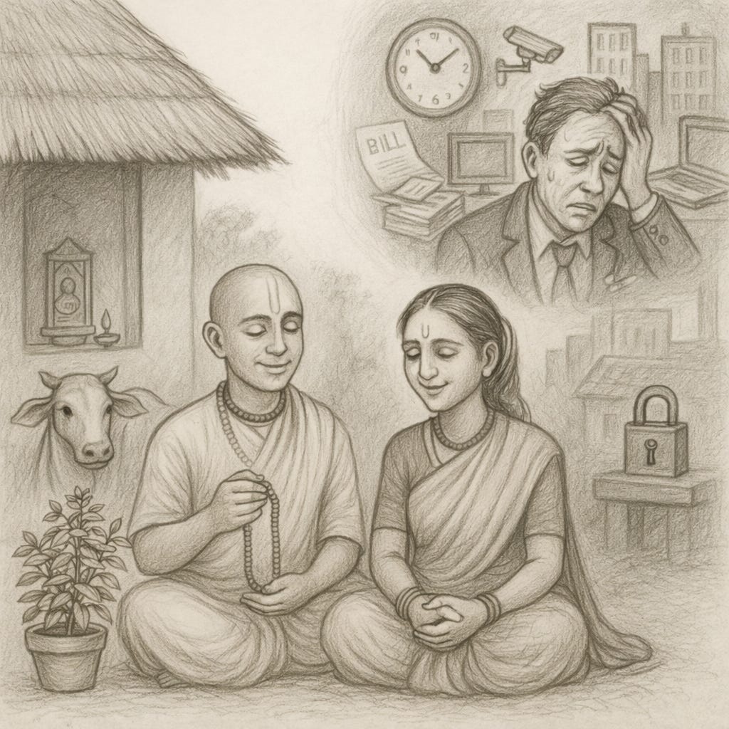 Śrila Prabhupāda wrote much about the concept of simple and spiritually progressive life in his books, conveying the idea that happiness is not in material acquisitions but in regaining our eternal relationship with Kṛṣṇa. However, we may think that the concept of achieving pure devotional service is very distant, and meanwhile, we still have to satisfy our material desires. Most of our desires are connected with money, and thus we often think that we need more money to achieve material happiness, and to get money, we need to spend our time working more, learning to make investments, etc. However, this is a mistaken conclusion.