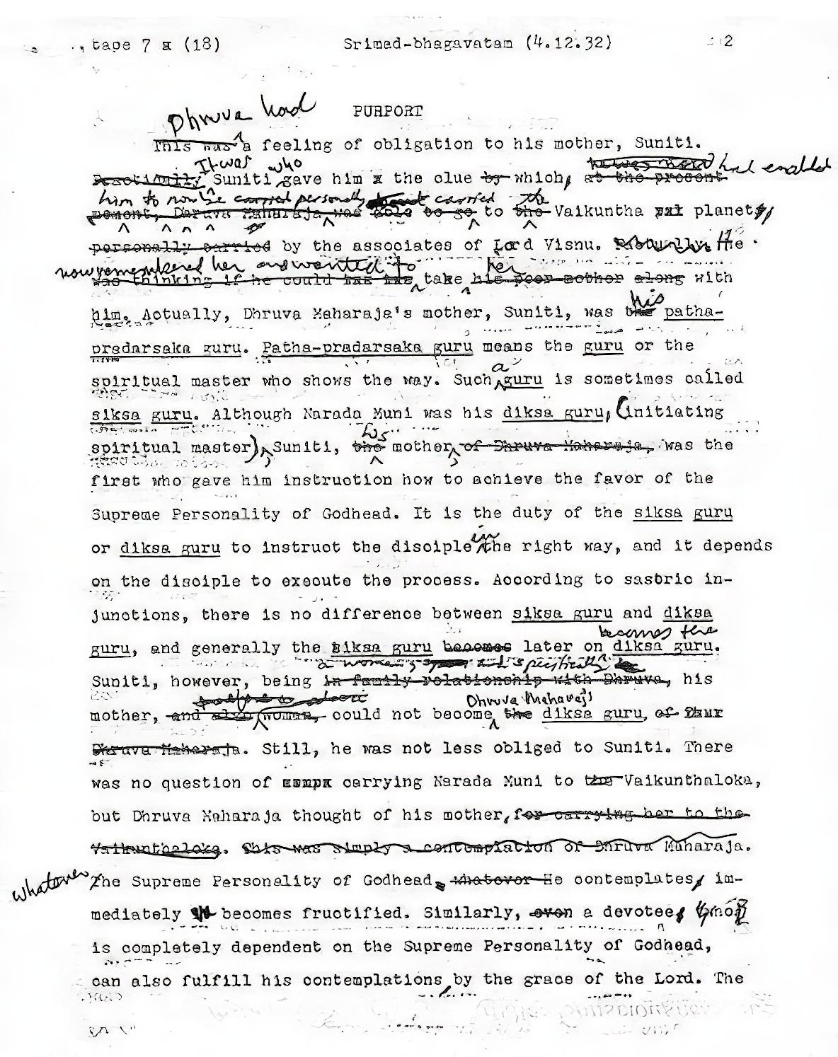 We can see that the words Srila Prabhupada recorded on tape convey a different idea than the final sentence printed in the original edition of the book, emphasizing the familial relationship of Suniti and Druva. How the sentence ended up becoming so different could be the subject of another discussion, but the fact remains. We are left thus with the need to properly understand it.