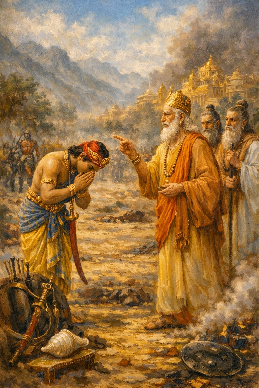 After urging Dhruva to stop his attack, Svāyambhuva Manu gives him instructions from verse 4.11.10 to 4.11.34. After receiving these instructions, Dhruva Maharaja immediately stopped fighting. The whole battle happened on the outskirts of Alakāpurī, the city of Kuvera, and thus, as soon as Dhruva stopped fighting, Kuvera heard the news and went to the spot to meet him.