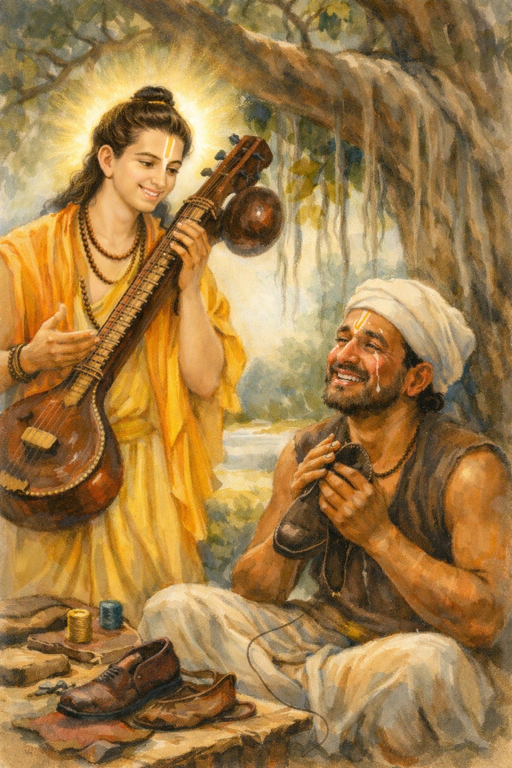 Nārada then understood that the brāhmana was just reading books but had no faith, while the cobbler, although uneducated, was a pure devotee and was thus ready to go back to Godhead.