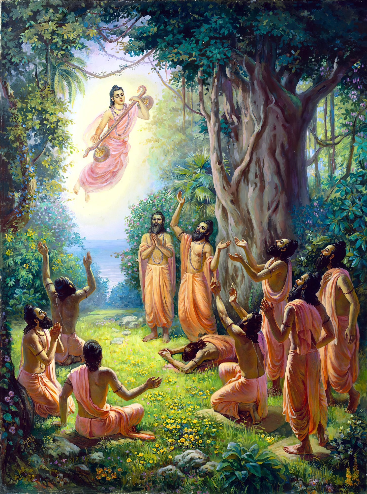 The feelings of the Pracetas in receiving Nārada are beautifully described by Prabhupada in his purport to text five: "Because of the night’s darkness, everyone is afraid of rogues and thieves, especially in great cities. People are often afraid to go out on the streets, and we understand that even in a great city like New York people do not like to go out at night. More or less, when it is night everyone is afraid, either in the city or in the village. However, as soon as the sun rises everyone is relieved. Similarly, this material world is dark by nature. Everyone is afraid of danger at every moment, but when one sees a devotee like Nārada, all fear is relieved. Just as the sun disperses darkness, the appearance of a great sage like Nārada disperses ignorance. When one meets Nārada or his representative, a spiritual master, one is freed from all anxiety brought about by ignorance."