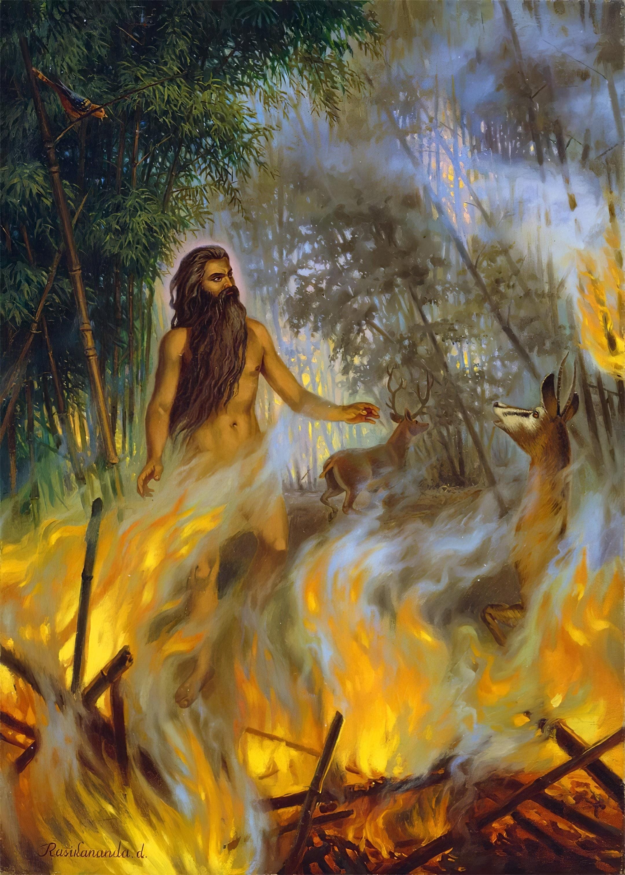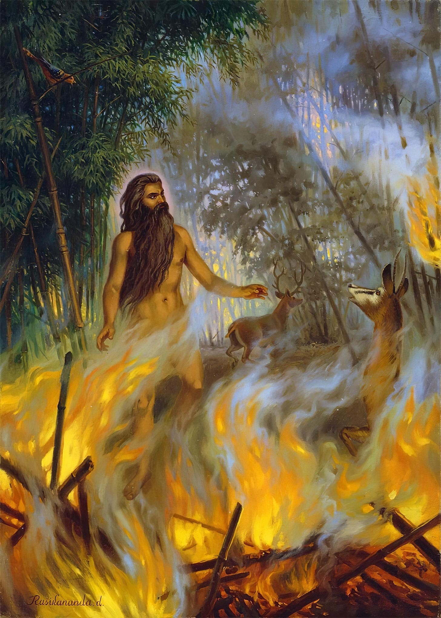 While He was wandering about, a wild forest fire began. This fire was caused by the friction of bamboos, which were being blown by the wind. In that fire, the entire forest near Kuṭakācala and the body of Lord Ṛṣabhadeva were burnt to ashes.” (SB 5.6.6-8)