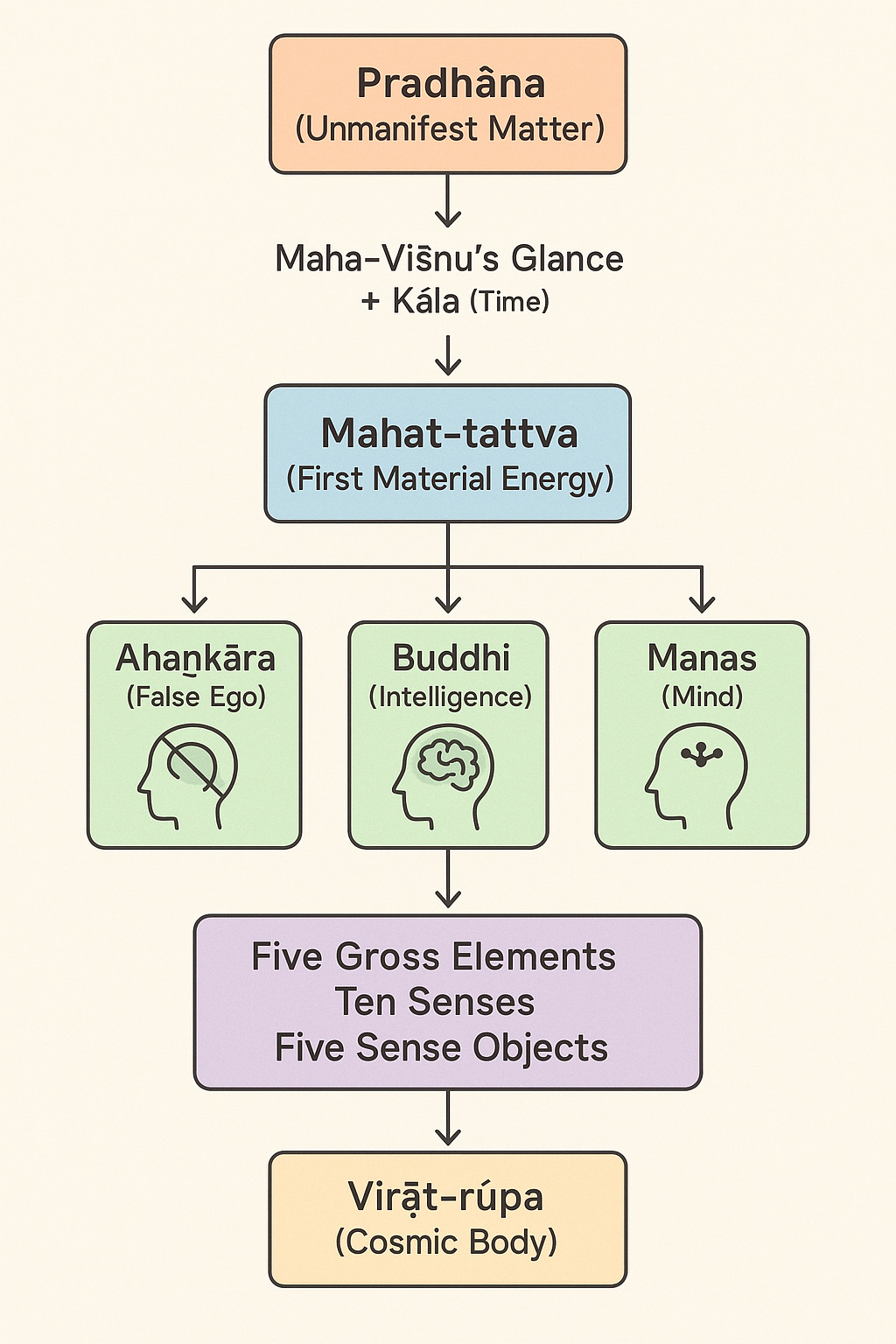 The material energy is first manifested in the form of pradhana, the gigantic mass of unmanifested material energy that appears like a cloud, covering part of the spiritual sky. After being impregnated by the time energy by Maha-Viṣnu, the three material modes become apparent (originally they are present, but merged into the mass of elements). From this point on, the pradhana gives birth to the mahat-tattva, and the chain of transformations that leads to the creation of the material universes starts.