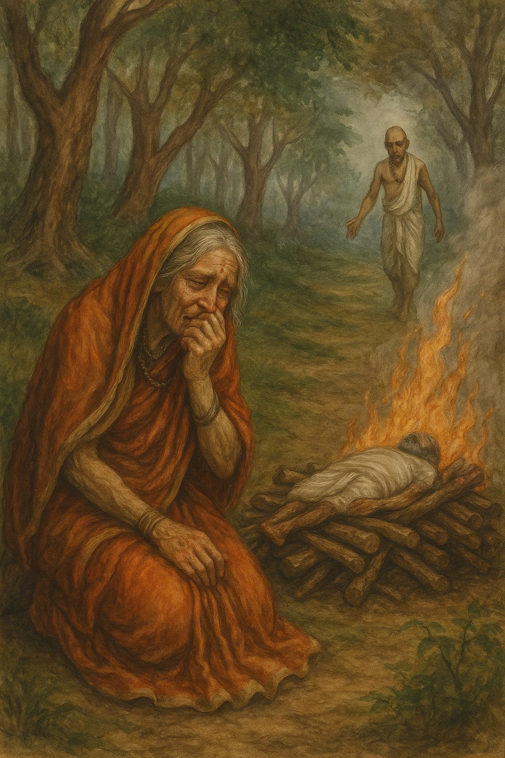 Eventually, the inevitable happened. Vaidarbhī, who had already abandoned her house and grown-up children, now saw herself bereft of her only companion, the husband she had served so faithfully her whole life. She lamented for some time, but somehow found the determination to fulfill her last duty, to cremate the dead body of her husband.