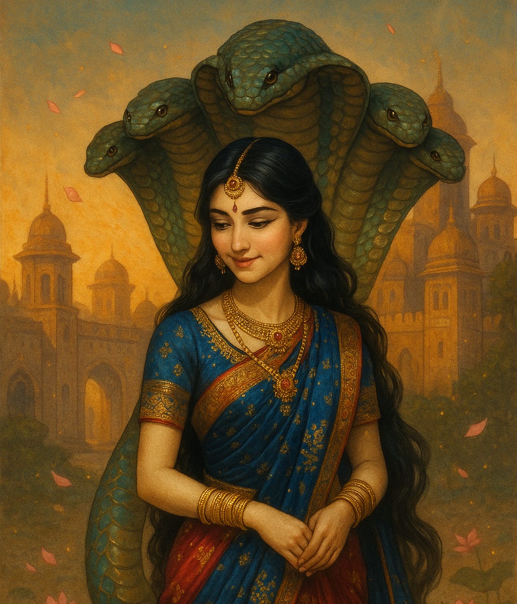 “While wandering here and there in that wonderful garden, King Purañjana suddenly came in contact with a very beautiful woman who was walking there without any engagement. She had ten servants with her, and each servant had hundreds of wives accompanying him. The woman was protected on all sides by a five-hooded snake. She was very beautiful and young, and she appeared very anxious to find a suitable husband.” (SB 4.25.20-21)