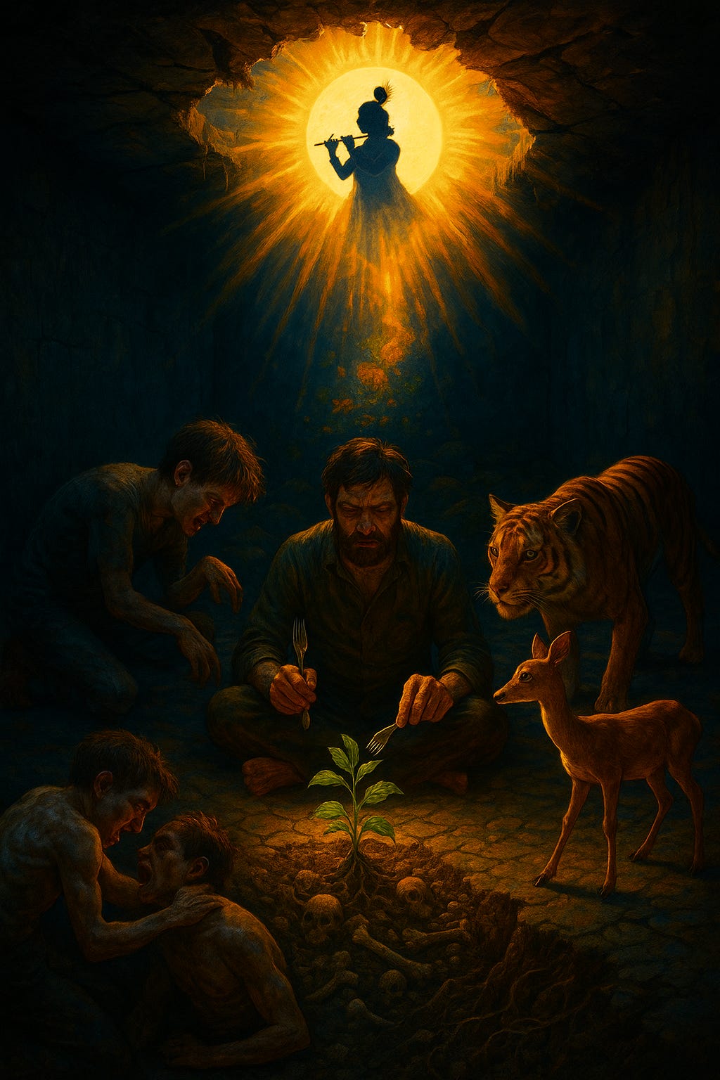 Imagine a horror movie where people are locked inside a dark basement and have to eat each other to survive. It sounds pretty scary, but that's our situation here in the material world.