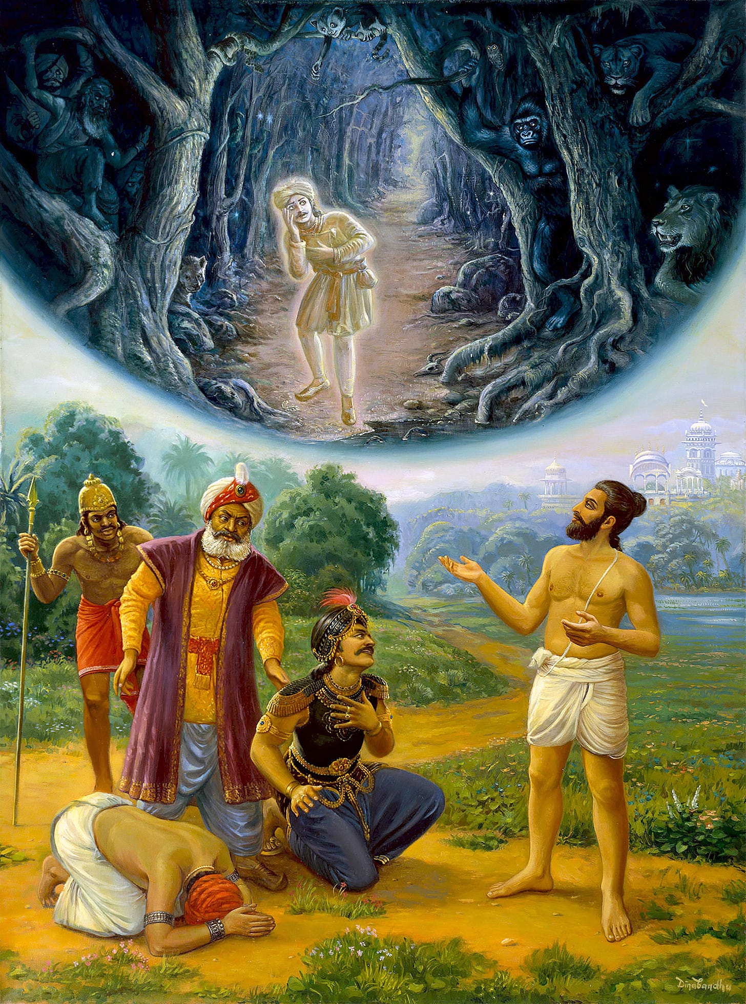 One could question what is the necessity of Jaḍa Bharata coming back to a discussion about the material world after revealing that the ultimate goal is Kṛṣṇa, but the point is that fixing ourselves on the spiritual platform is not so easy. Even after attaining an advanced platform, like Bharata Maharaja, there is still the risk of falling into bad association. As long as we have a naive understanding of this material world, seeing it as a place of enjoyment, we will always remain attracted to it, and thus propense to fall back into bad association. Jaḍa Bharata thus describes different situations we experience at different points of our lives and their outcomes, helping us to develop a more realistic understanding of the struggles of materialistic life. This understanding can help us to disassociate ourselves from it.