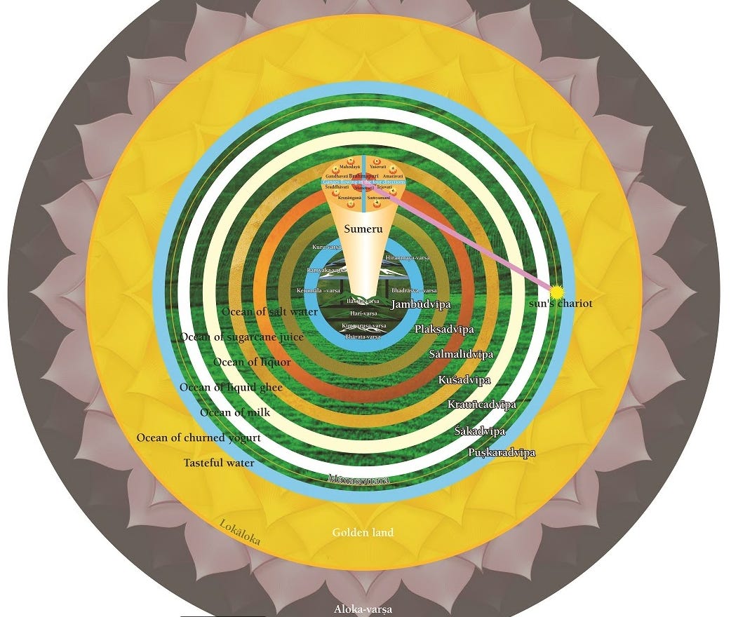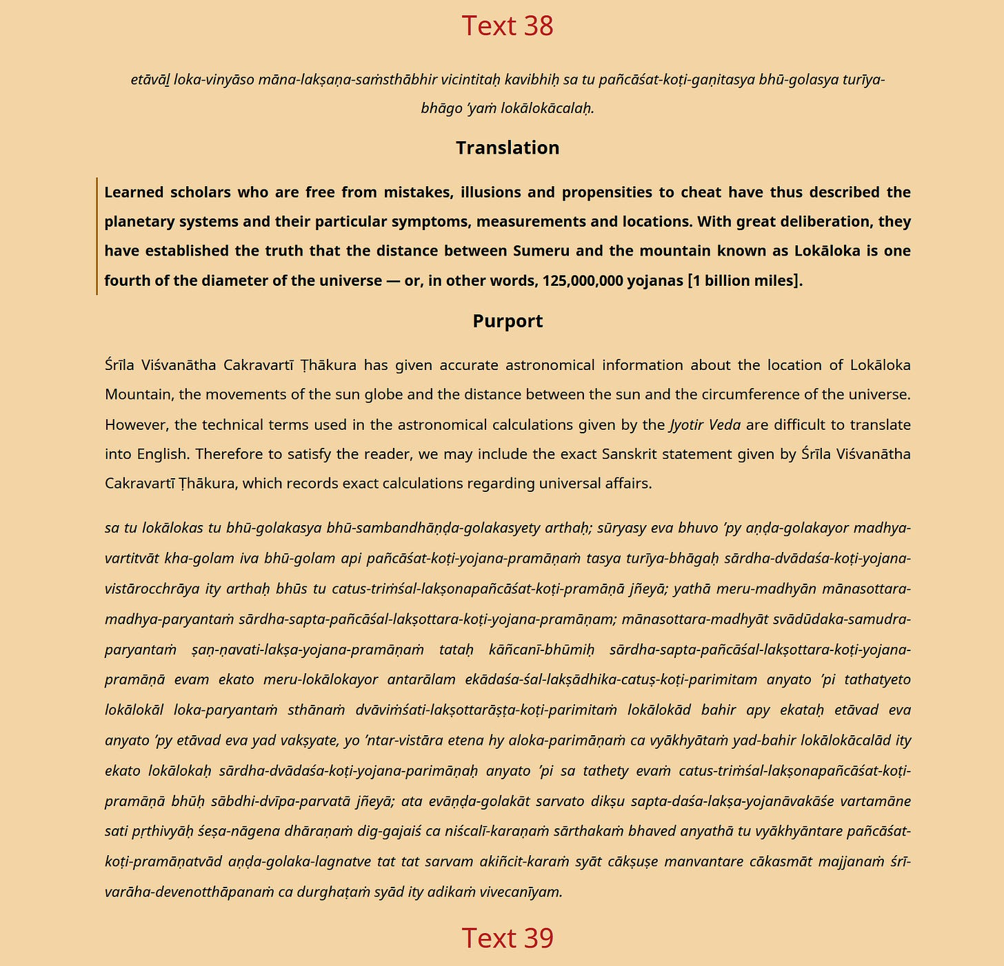 “Here, Lokāloka is to be understood to be the boundary between the bhū-golaka and the aṇḍa-golaka. Both the sun and the earth are situated in the vertical middle of the universe. The area occupied by both Bhū-mandala and the kha-gola spread for fifty koṭi yojanas (500,000,000 yojanas). One quarter of this is twelve-and-a-half koṭi yojanas in extent (125,000,000 yojanas). However, the whole Bhū-mandala should be known as having the measure of 49 koṭi plus 34 lakṣas yojanas (493,400,000 yojanas).”