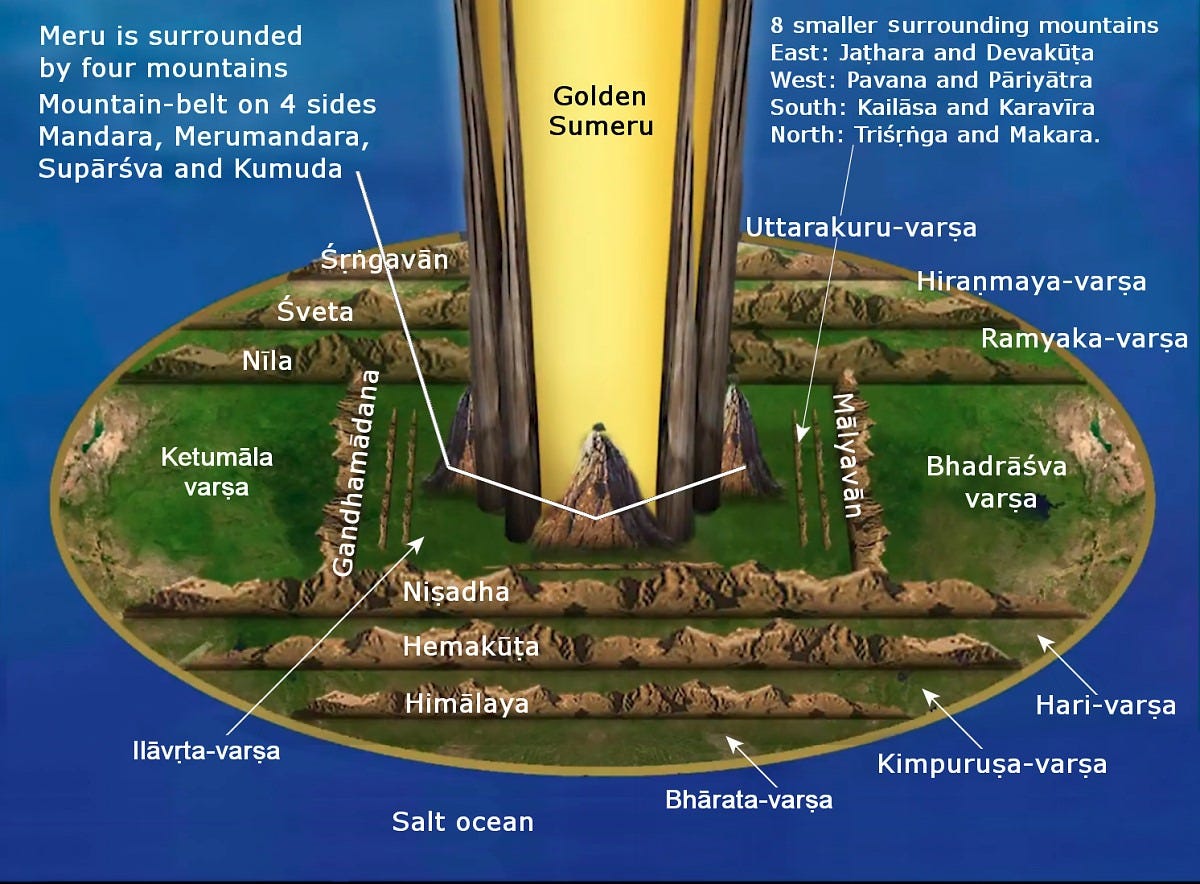 Jambūdvīpa is described as round like the leaf of a lotus flower. It is divided into nine varṣas, or tracts of land, separated by giga…