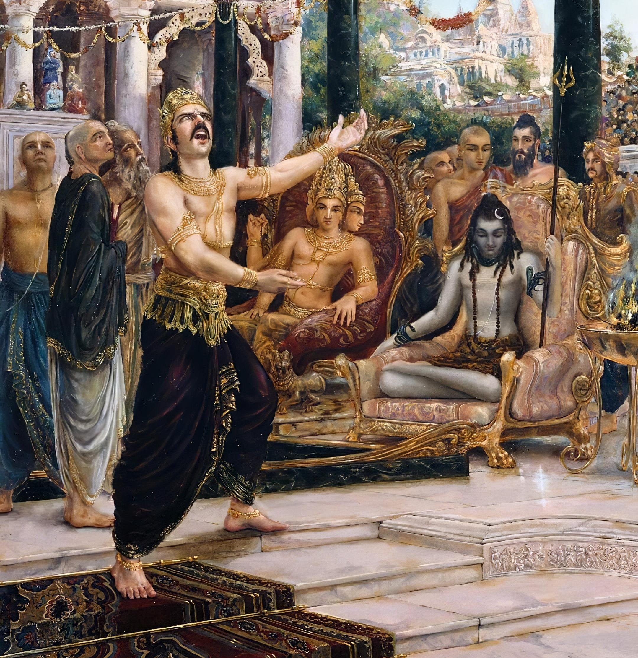 Once, when executing a great sacrifice, Daksa felt offended when Lord Shiva didn't get up when he entered the room. Blinded by pride, Daksa saw Lord Shiva as a subordinate (because he had become his son-in-law) and thought he had to offer him respect. Lord Shiva however has no need to do that, because his position is higher than any conditioned soul. Often Vaishnavas offer respect to atheists in higher positions by offering their obeisances to the Supersoul inside the body, but in the case of Lord Shiva, even that was unnecessary because he is constantly offering respects to the Lord in his meditation.