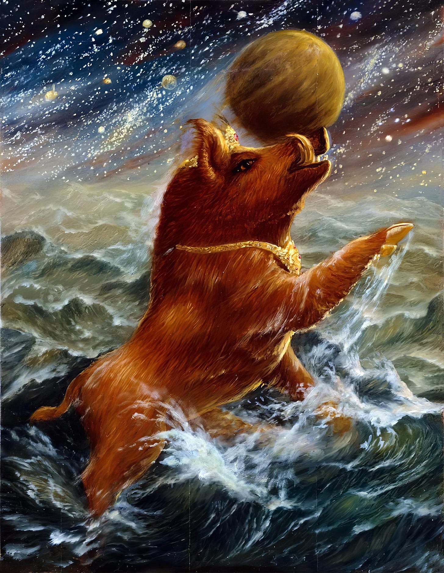 Finally, He entered into the cosmic ocean with great force, creating two great waves that looked like two gigantic arms. Playing like a hog, the Lord found the Earth by smell and lifted her from the bottom of the ocean by balancing the planet on his tusk. At this moment, He appeared very splendid.