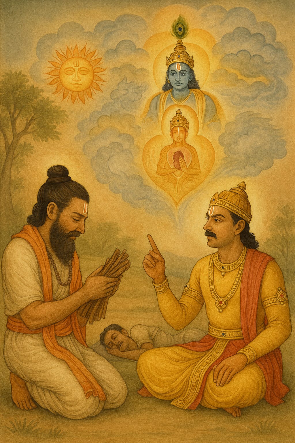 However, the consciousness is still there, and eventually we awake from this deep sleep. This proves that the soul is different from the external consciousness we display when awake and different from the physical body itself. In this way, Ajātaśatru teaches the foundation of transcendental knowledge, the difference of body and soul.