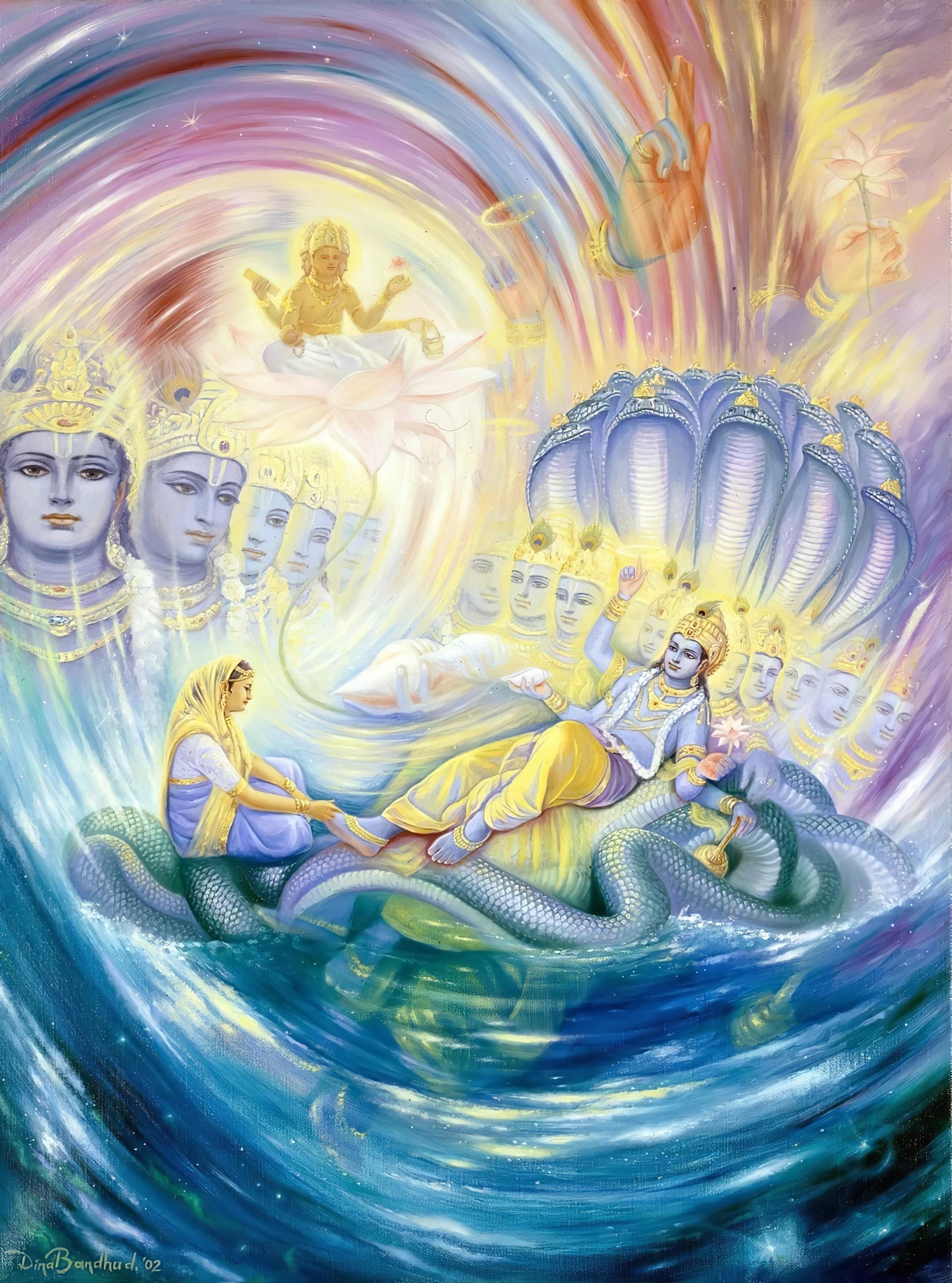 "Therefore it is best for me to surrender unto His feet, which alone can deliver one from the miseries of repeated birth and death. Such surrender is all-auspicious and allows one to perceive all happiness. Even the sky cannot estimate the limits of its own expansion. So what can others do when the Lord Himself is unable to estimate His own limits?" (SB 2.36.36)