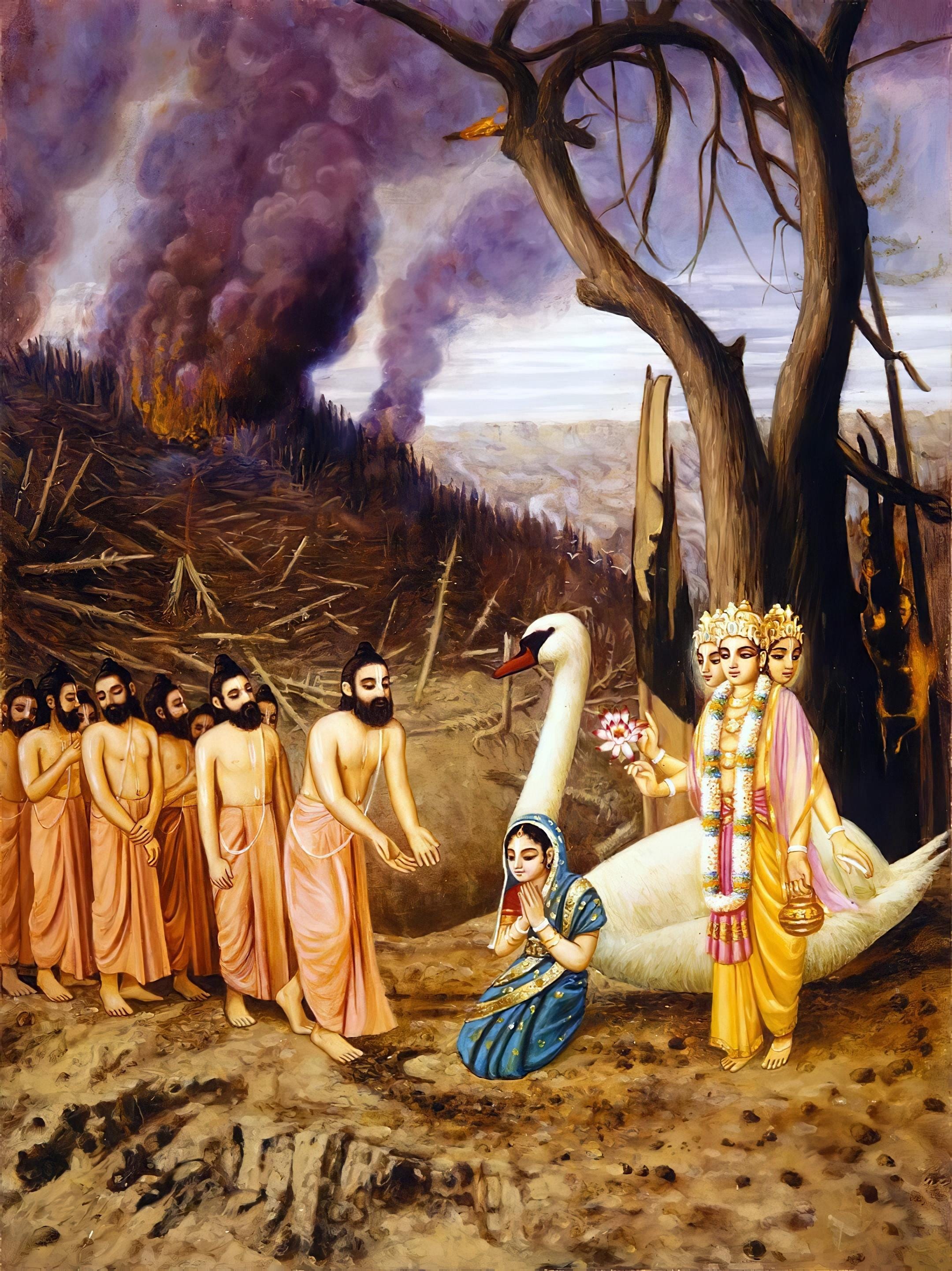 After milking the Earth, ruling, and meeting the four Kumaras, Pṛthu Maharaja retired from his duties as king, went to practice austerities in the forest, and eventually returned home to Godhead.