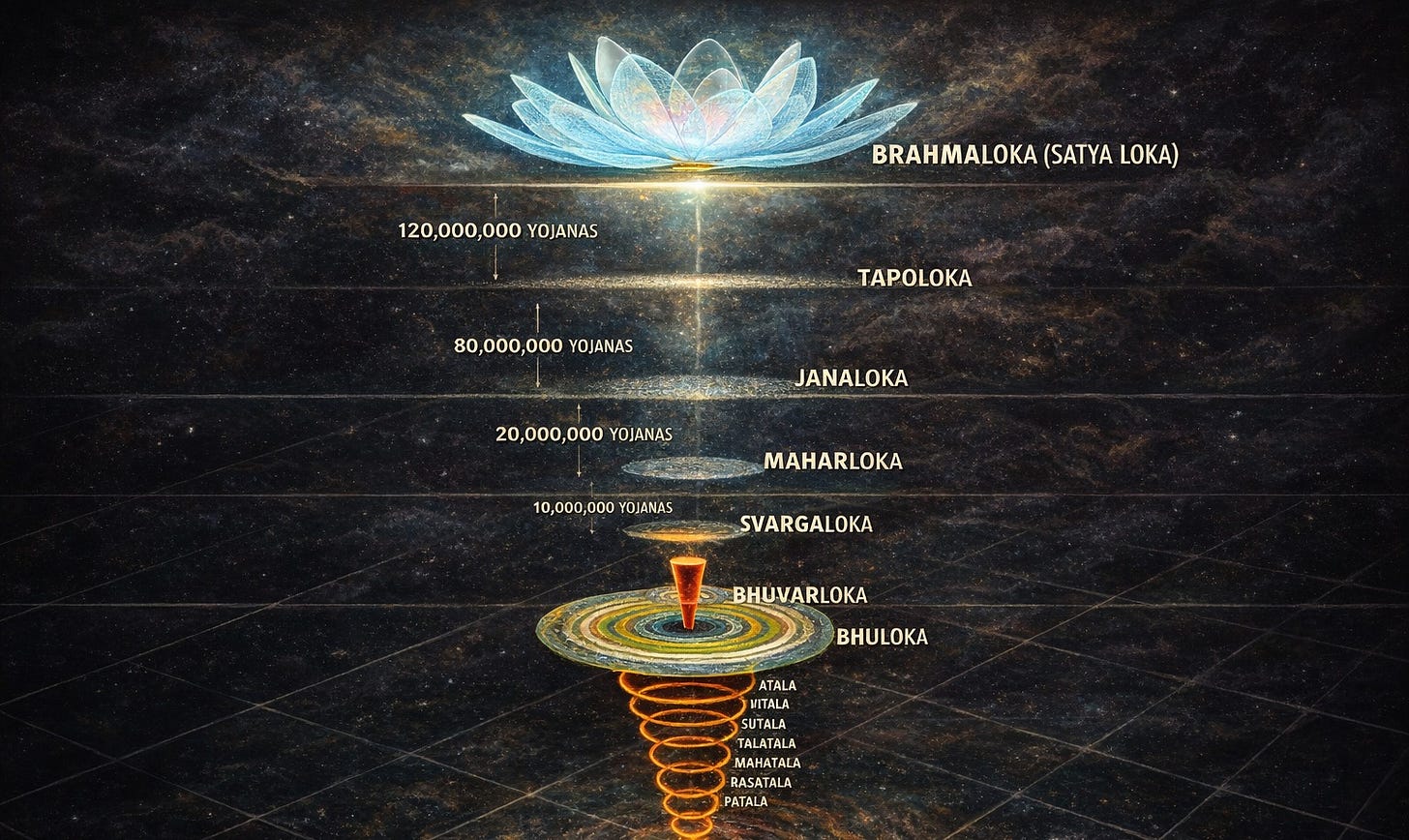 The Śrīmad-Bhāgavatam explains that our universe is divided into 14 planetary systems. Each planetary system is formed by millions of different planets or stars spread throughout the cosmos, but they are categorized based on the level of consciousness of the inhabitants. In the Vedic model, consciousness creates reality. The environment we live in, including the type of body and senses we have, is determined by our previous consciousness, and similarly, what we do now shapes our consciousness in a certain way, and that will determine where we go next. In this way, we continuously travel through these 14 planetary systems, following the wheel of saṁsāra.