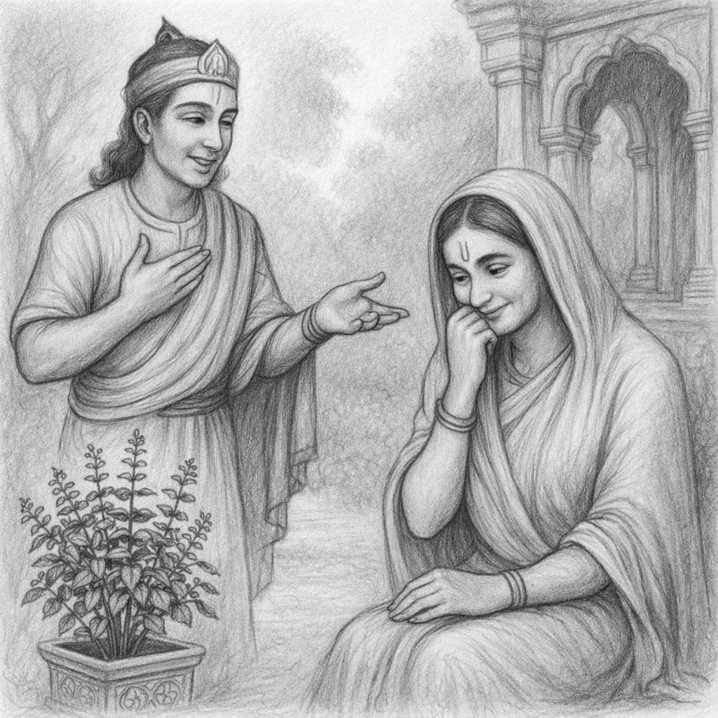 The story is that Śankhacūḍa approached Tulasi, intending to marry her. Tulasi was actually waiting for Śankhacūḍa, and she had already decided to marry him. It’s described that Tulasi blushed and hid her face with her veil, secretly smiling at him.